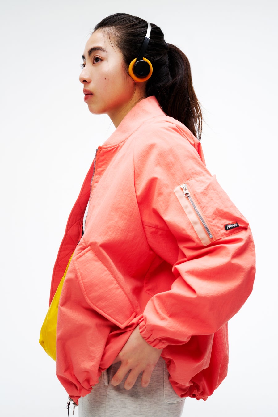ナイロンタッサー素材を使用したウィメンズのジャケット。ミリタリーのボンバージャケットをベースにしつつ、裾に向かって広がるAラインシルエットでフェミニンな印象をプラスしました。裾のコードを絞ることで、コクーンシルエットにもアレンジ可能です。