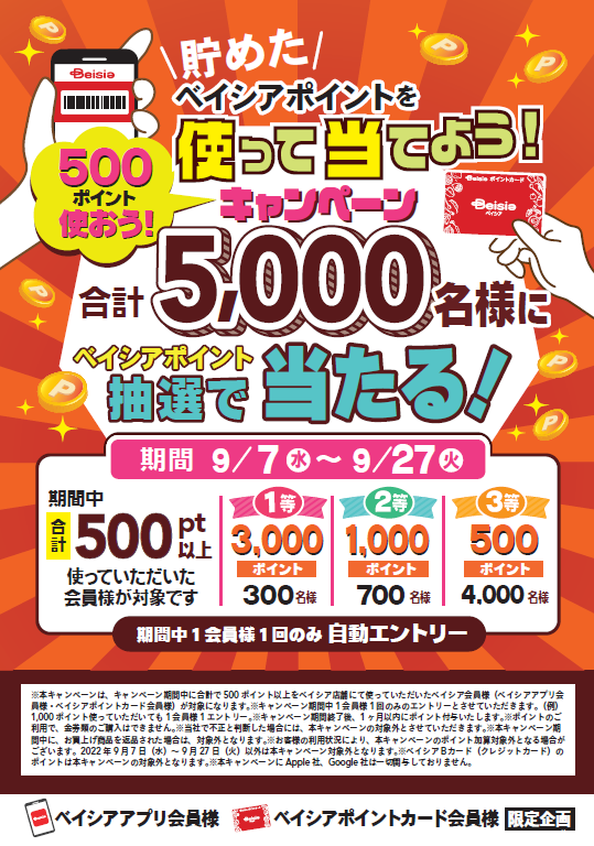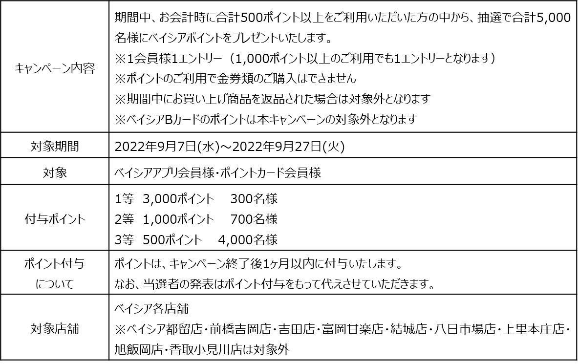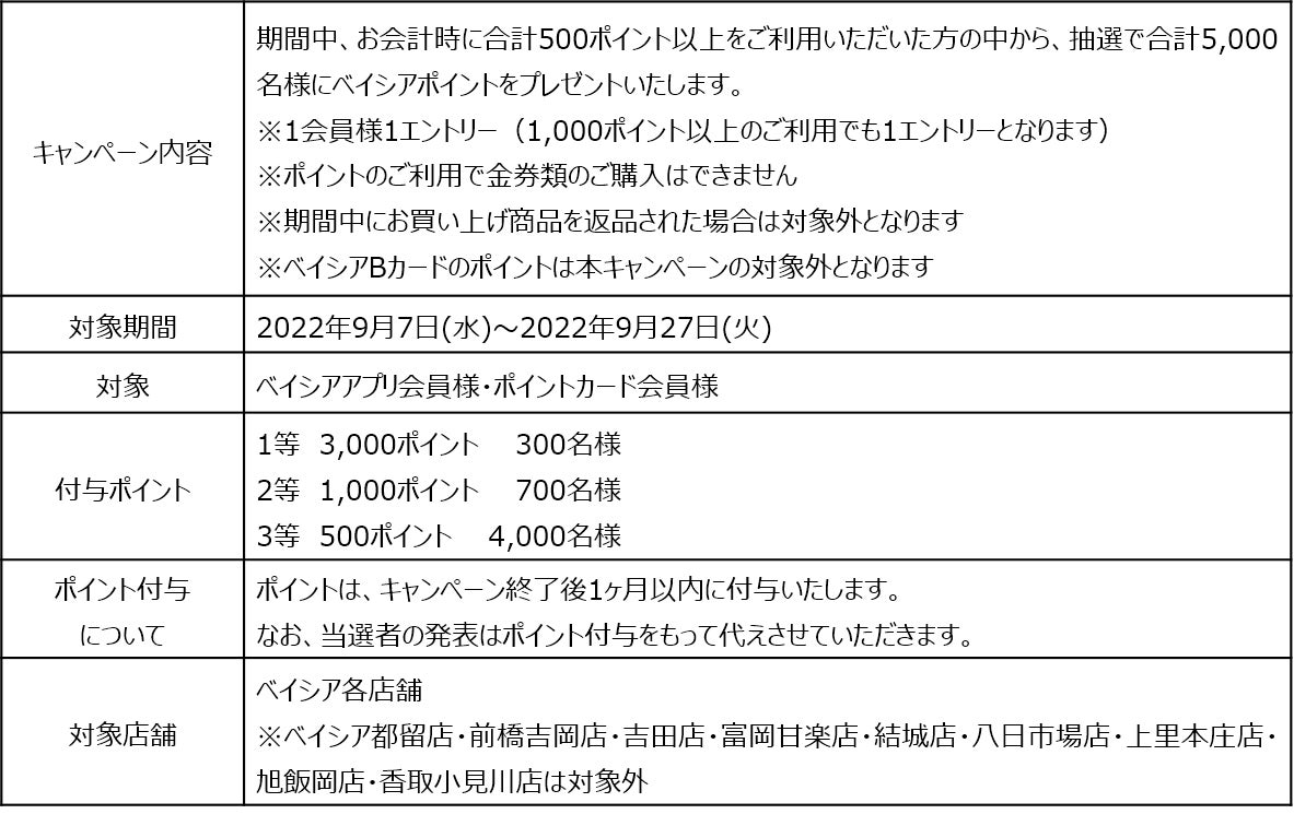 株式会社ベイシア(本社:群馬県前橋市、代表取締役社長:相木孝仁)は、9月7日(水)から27日(火)の期間で、「ベイシアポイントを使って当てよう!」キャンペーンを実施いたします。キャンペーン期間中、お会計時に合計500ポイント以上をご利用いただいた方の中から、抽選で合計5,000名様にベイシアポイントをプレゼントいたします。日頃のお買い物で貯めていただいたポイントを、この機会にぜひご利用ください。