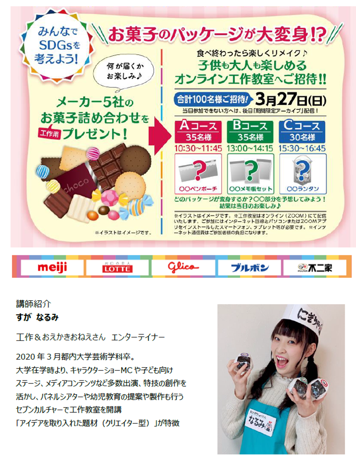 株式会社セブンカルチャーネットワーク(本社:東京都千代田区、代表取締役社長:萩原秀之)は、SDGsを身近に、そして楽しく考えていただくために、全国のイトーヨーカドー店頭で実施されるお菓子の購買促進キャンペーンとタイアップし、親子で参加できるお菓子のパッケージを使ったオンライン工作イベントを実施いたします。