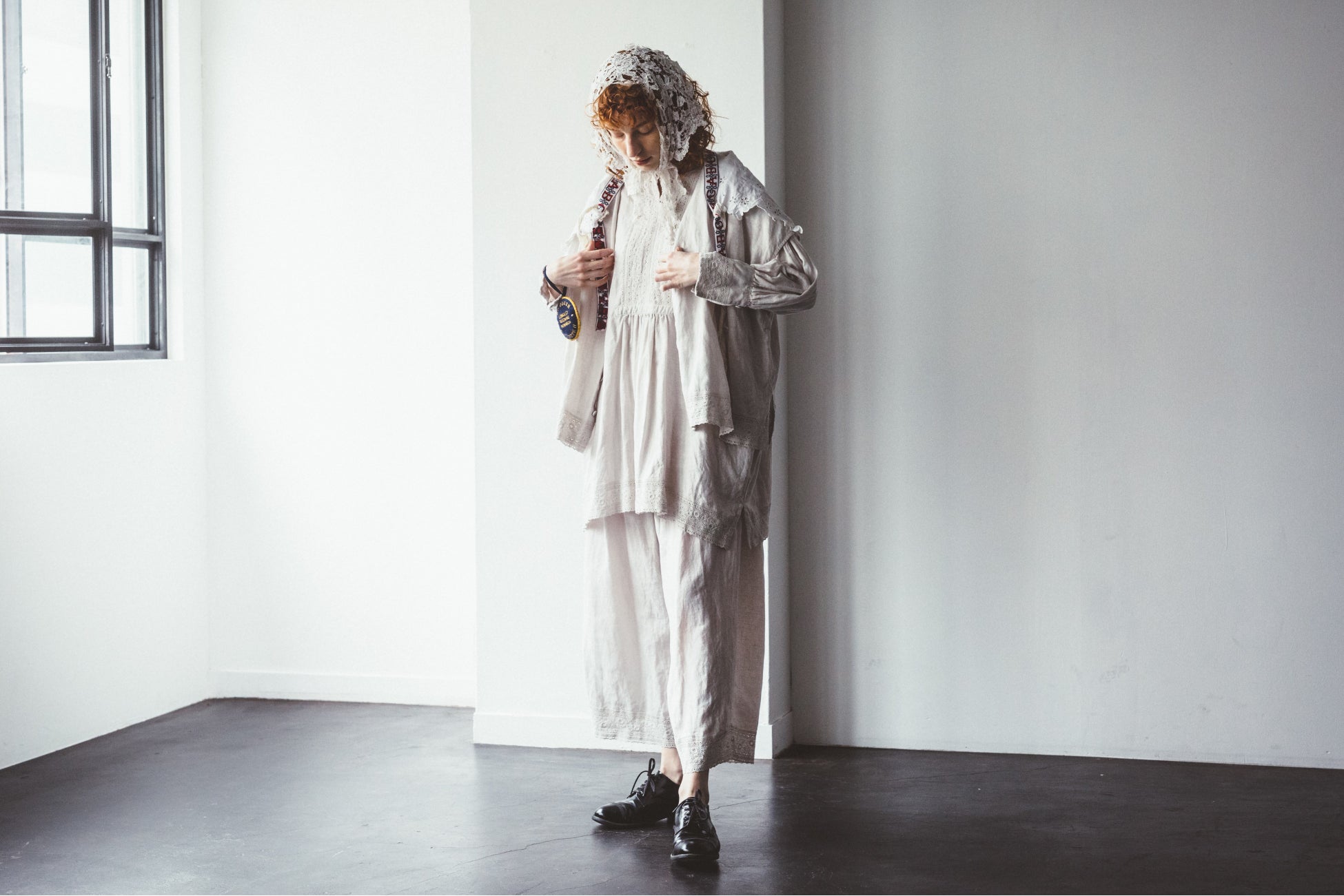 リネンのナチュラルな風合いと上品なアイレットレースで秋の装いを彩る。
