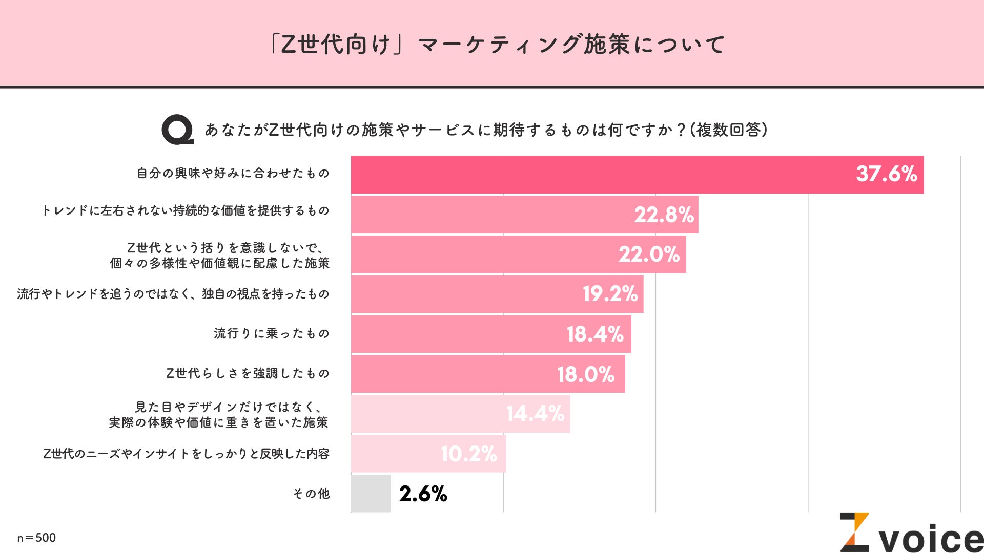 もっとも多かったのは「自分の興味や好みにあわせたもの(37.6%)」。次いで「トレンドに左右されない持続的な価値を提供するもの(22.8%)」、「Z世代という括りを意識しないで、個々の多様性や価値観に配慮した施策(22.0%)」となりました。