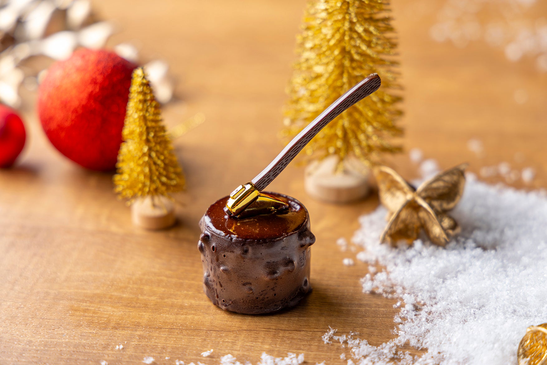 プレミアムプラン限定!目の前で粉砂糖をふりかけ仕上げる演出をお楽しみいただけます。濃厚なチョコレートムースに、キュートなサンタクロースの工房をイメージしたチョコレートを添えてご提供いたします。