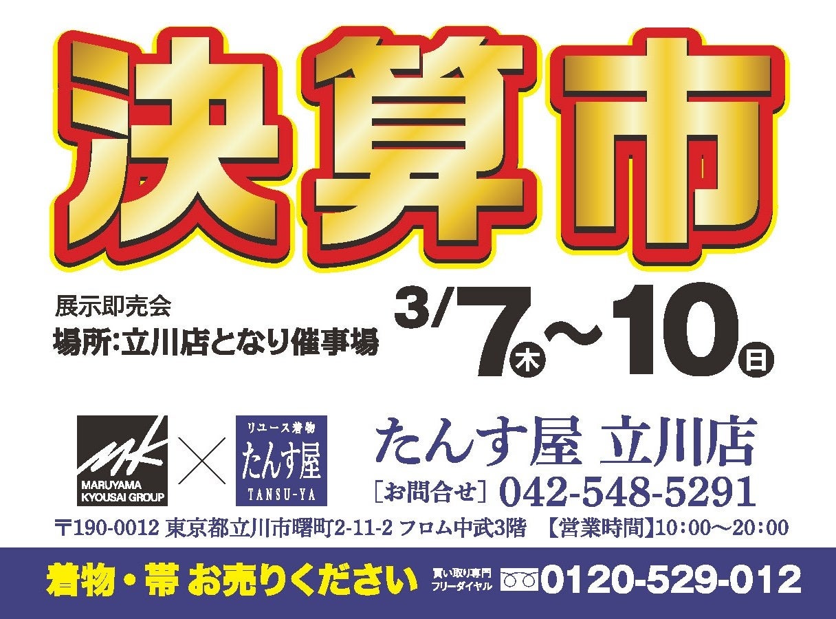 たんす屋立川店は、この度、日頃のご愛顧に心より感謝を込めて、2024年3月7日(木)から3月10日(日)までの4日間、隣接する催事場にて「決算市」を開催いたします。