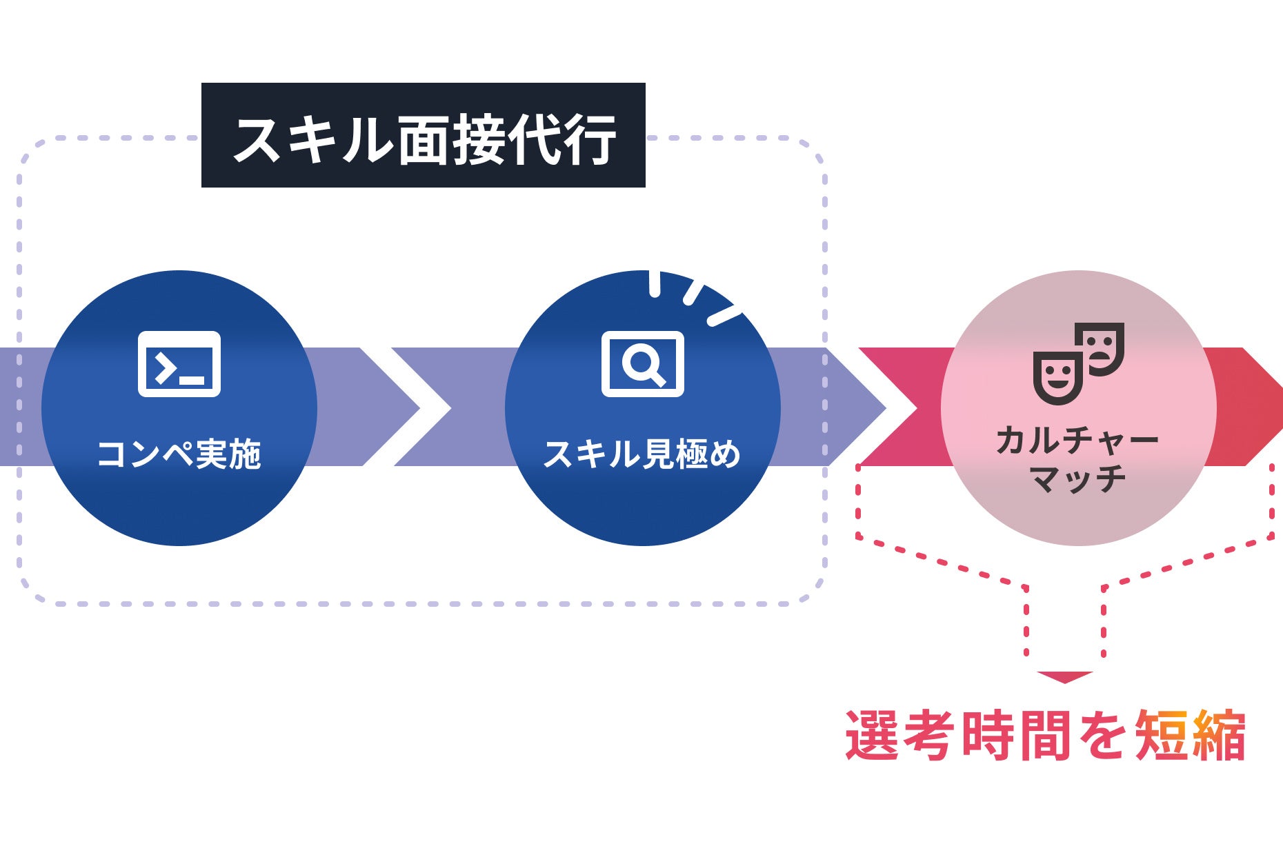 「HireRoo Skill Hiring」は、エンジニアのスキルを事前に可視化し、最適なマッチングを実現するスキル保証型の採用サービスです。ハイヤールーがスキル面接を代行し、企業はカルチャーマッチやアトラクトに専念できるため、選考リードタイムを短縮し効率的な採用を実現します。