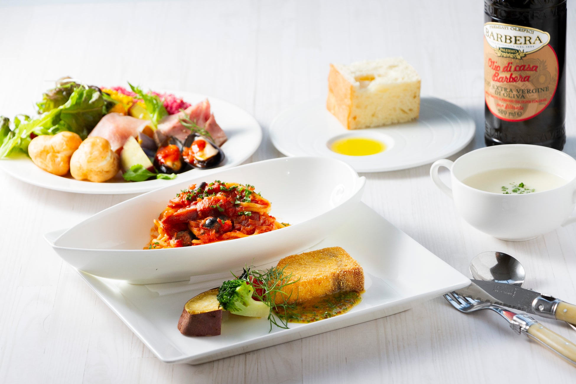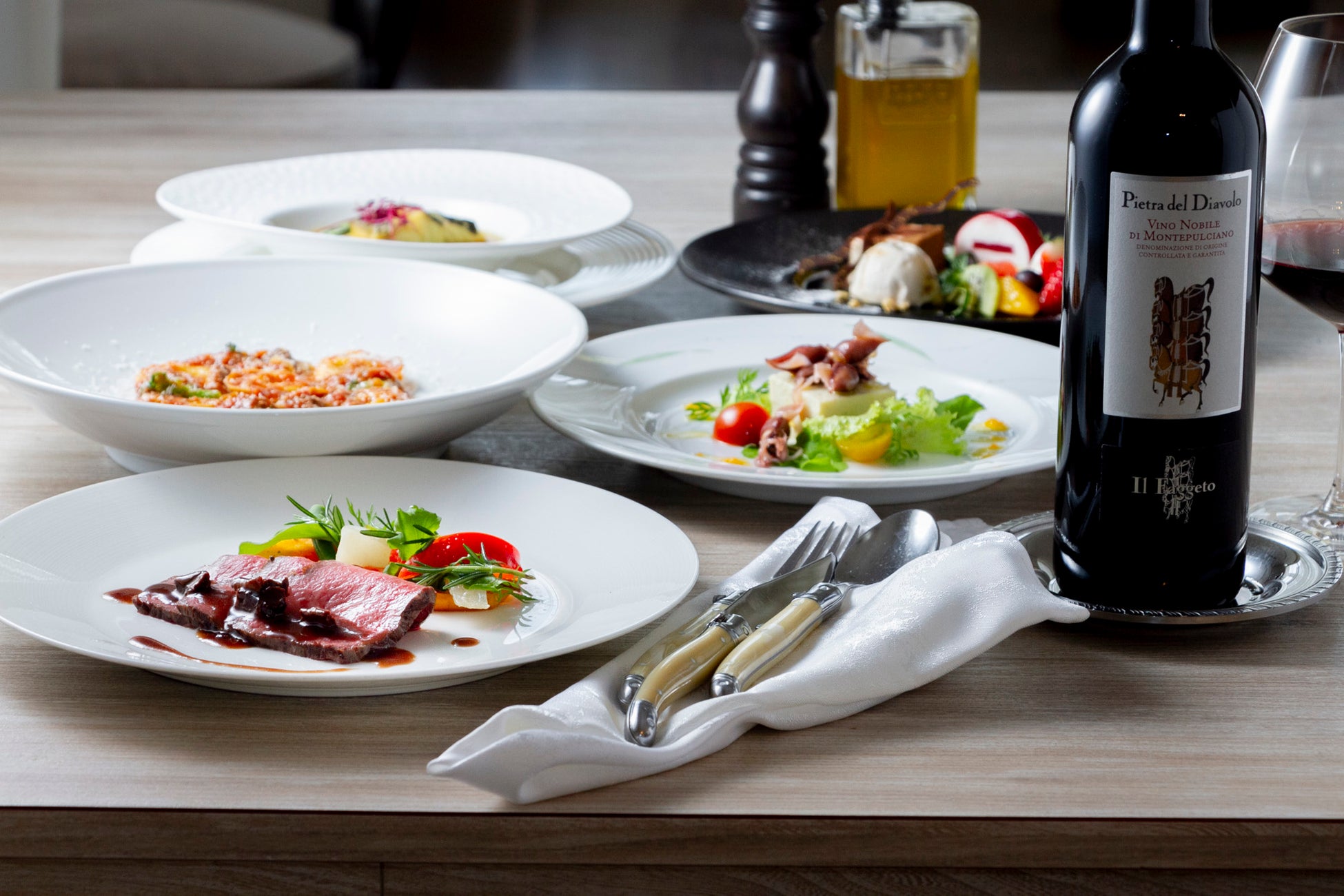 大きな窓から自然光がたっぷりと降り注ぐ店内は、明るく開放的な空間が広がります。お料理に合わせた厳選ワインも数多く揃え、皆様のお越しをお待ちしております。