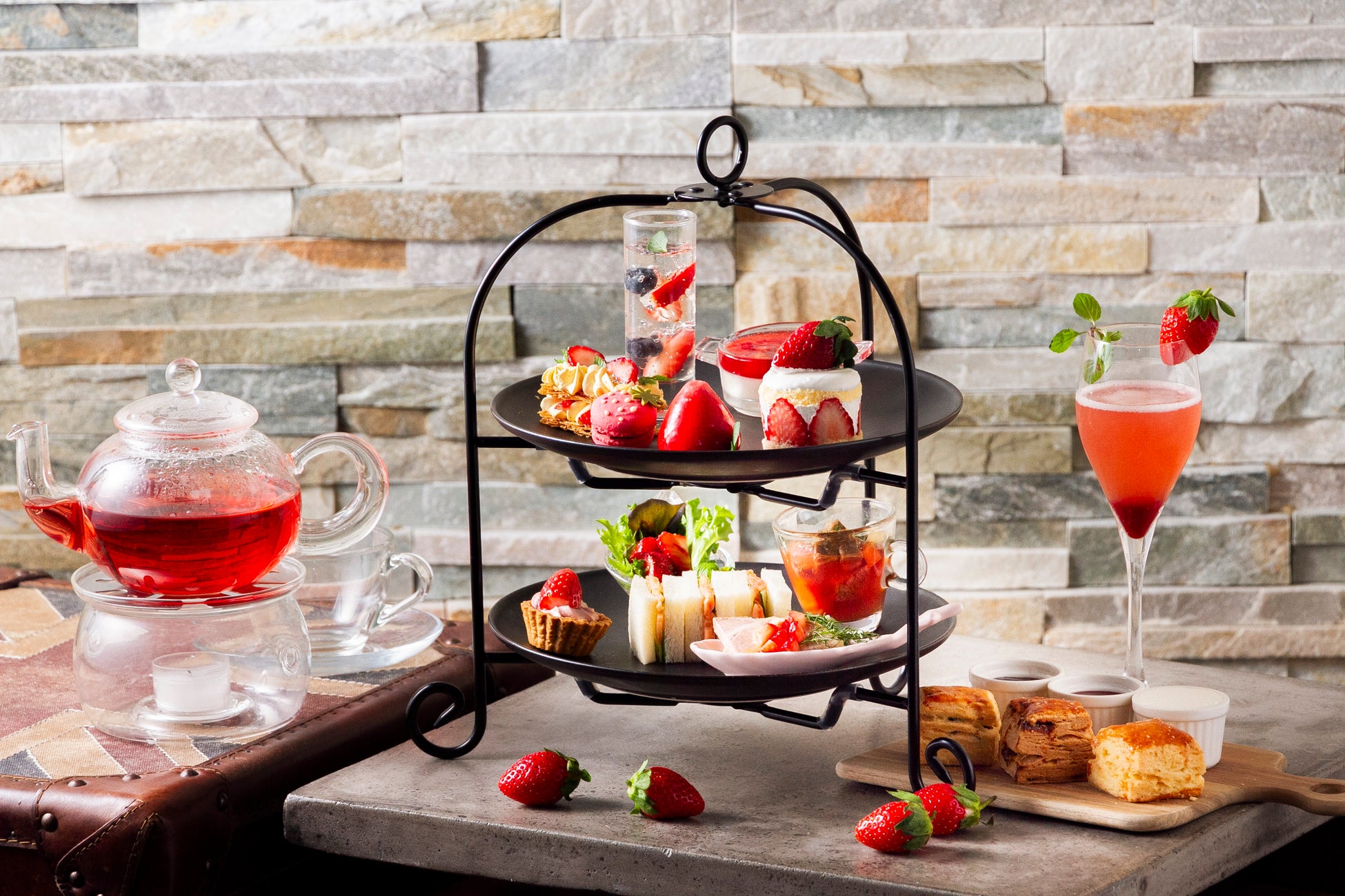 いちごをふんだんに使用し、パティシエが趣向をこらした華やかなスイーツ、定番のサンドウィッチや、いちごをちりばめたシェフ特製セイボリー、さらにノンアルコールスパークリングワイン(グラス)、自家製スコーン3種の食べ放題(90分)、ティーフリー(90分)がセットと盛り沢山でご提供いたします。