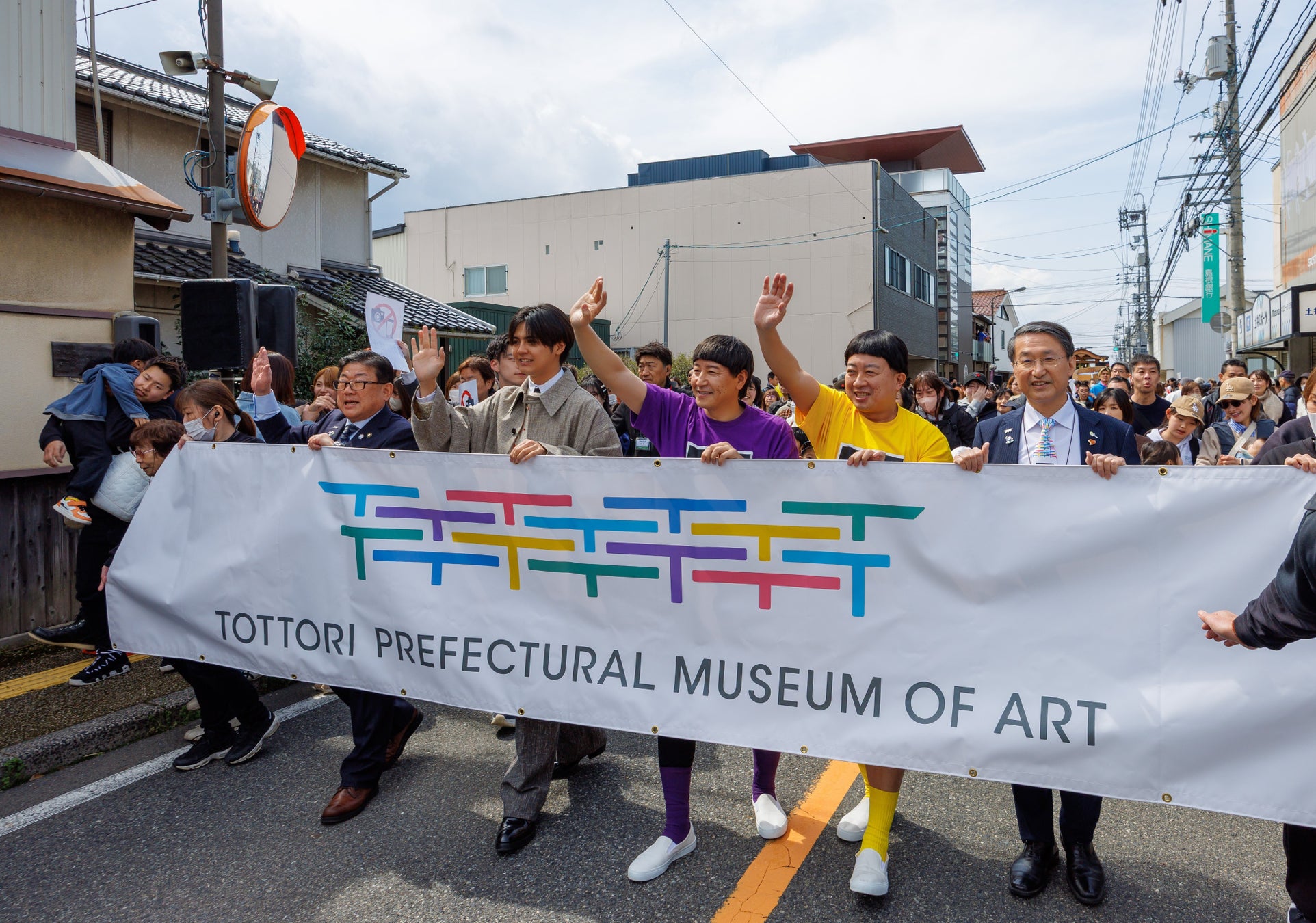 開館前日の3月29日(土)、倉吉市内の各地でオープニングを祝う様々なイベントが開催されました。打吹回廊では、祝賀パレードのスタートセレモニーが実施されました。県内外から集まった観衆の前に、県立美術館のロゴと大きなTの文字が描かれたネクタイをした平井県知事と、「グランドオープンアンバサダー」の片寄涼太さん(GENERATIONS)、さらに「とりび大使」に就任し約1ヶ月前から開館を盛り上げて下さっているチョコレートプラネットのお二人らが大歓声のなかで登場。チョコレートプラネットのお二人は、2月5日に東京都内で行われた「とりび大使」就任式で知事からプレゼントされた鮮やかなパープルとイエローのユニフォームに身を包み、「TTり(鳥取)県立美術館のとりび大使に就任しうれてぃ(嬉しい)です。もってぃもってぃ(もっともっと)盛り上げていきてぃ(いきたい)です。」とコメントしました。そして「パレード・オン・パレード、スターティ(スタート)です!」という掛け声とともに、お囃子や鼓笛隊、ダンスパーティーなど約1000人で創り上げる、鳥取県立美術館までの祝賀パレードがスタート。片寄さん・チョコレートプラネットのお二人も知事とともにパレードの先頭を歩き、集まった皆さんに笑顔で手を振り応えました。
