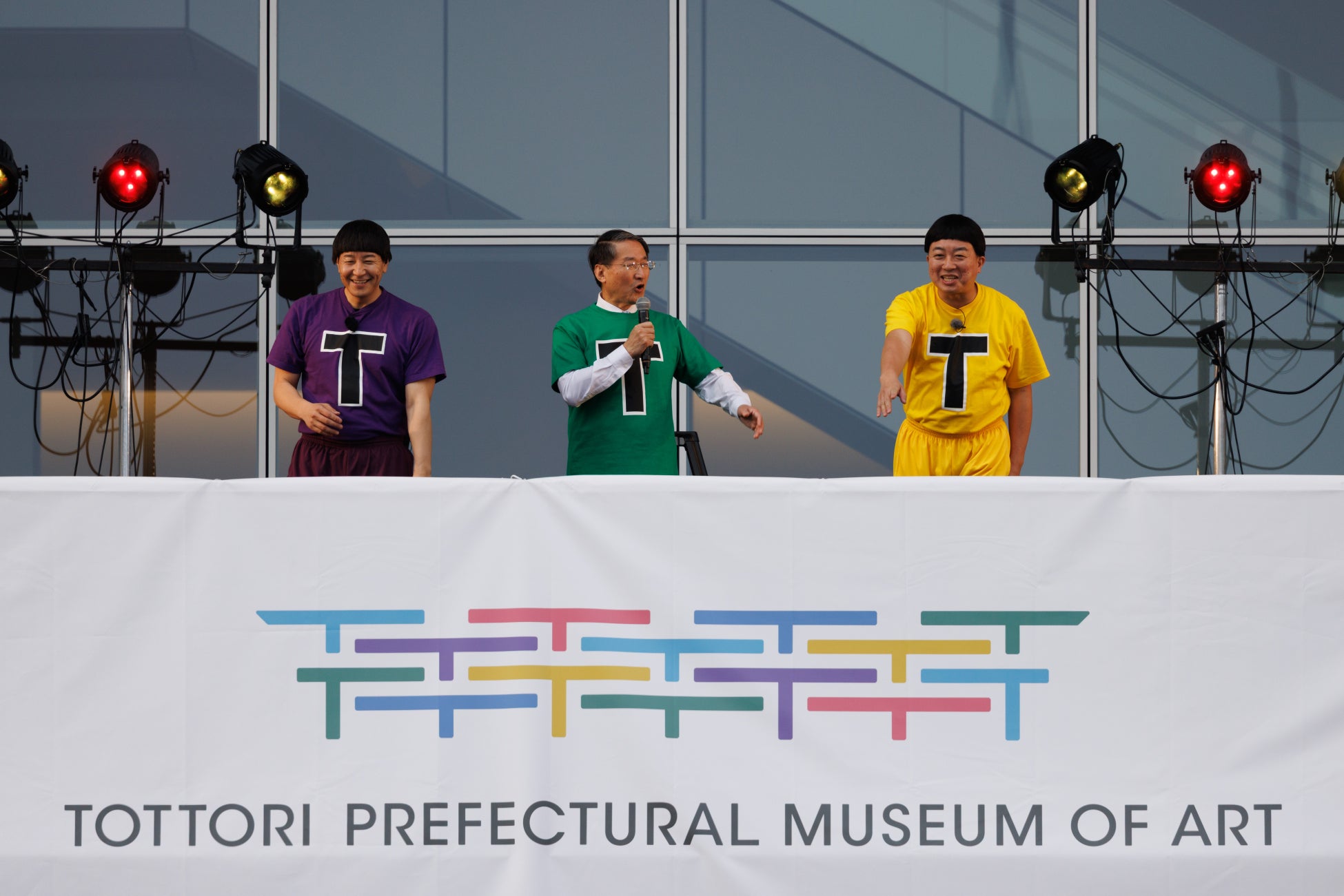 続いて、美術館の2階テラスで行われたミュージックセレブレーションにもチョコレートプラネットのお二人が登場。「鳥取県立美術館は建物も素敵で、アート作品も様々なジャンルが見れてとても楽しい。カラフルなロゴには、Tの文字が14個も使ってあるのでTTり(鳥取)県が自分たちのふるさとかと思いました。いつでも気軽に立ち寄れる場所なのでぜひ来てほしい。」とコメント。また「とりび大使」就任発表会以来の知事とのステージ共演となったことについて、「ティッティリ(鳥取)県には、二十世紀なてぃ(梨)などのフルーティ(フルーツ)もあり、Tがたくさんあるいい県。」と鳥取県のイメージをTを織り交ぜて話しました。