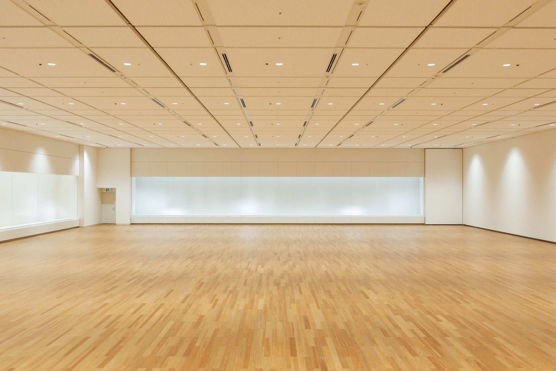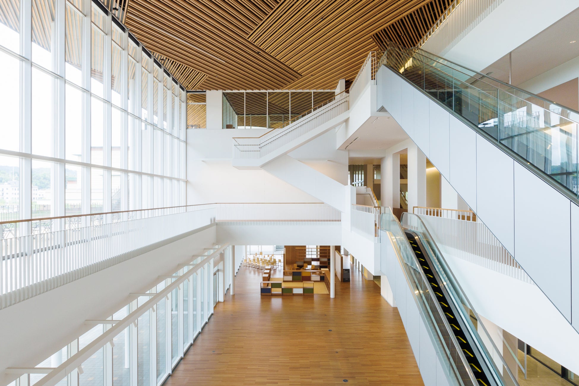 館内は美術館としては珍しい、自然光が差し込む明るく開放的な空間が特徴です。「ひろま」は3階までの吹き抜けの、木のぬくもりが感じられる居心地のよいスペースで、様々な価値観を広く受け入れる美術館の精神を表します。メインルームのひとつとなるのが、約1000㎡もの空間を有する3階の「企画展示室」。壁面や室内に柱がない無柱の大空間を実現しており、最大48枚の稼働間仕切りが展示ごとに異なる空間を創出します。屋外階段でつながる「展望テラス」は、鳥取砂丘の風紋や伝統工芸である倉吉絣の織模様を思わせる天井が印象的。美術館前の大御堂廃寺跡を一望できます。