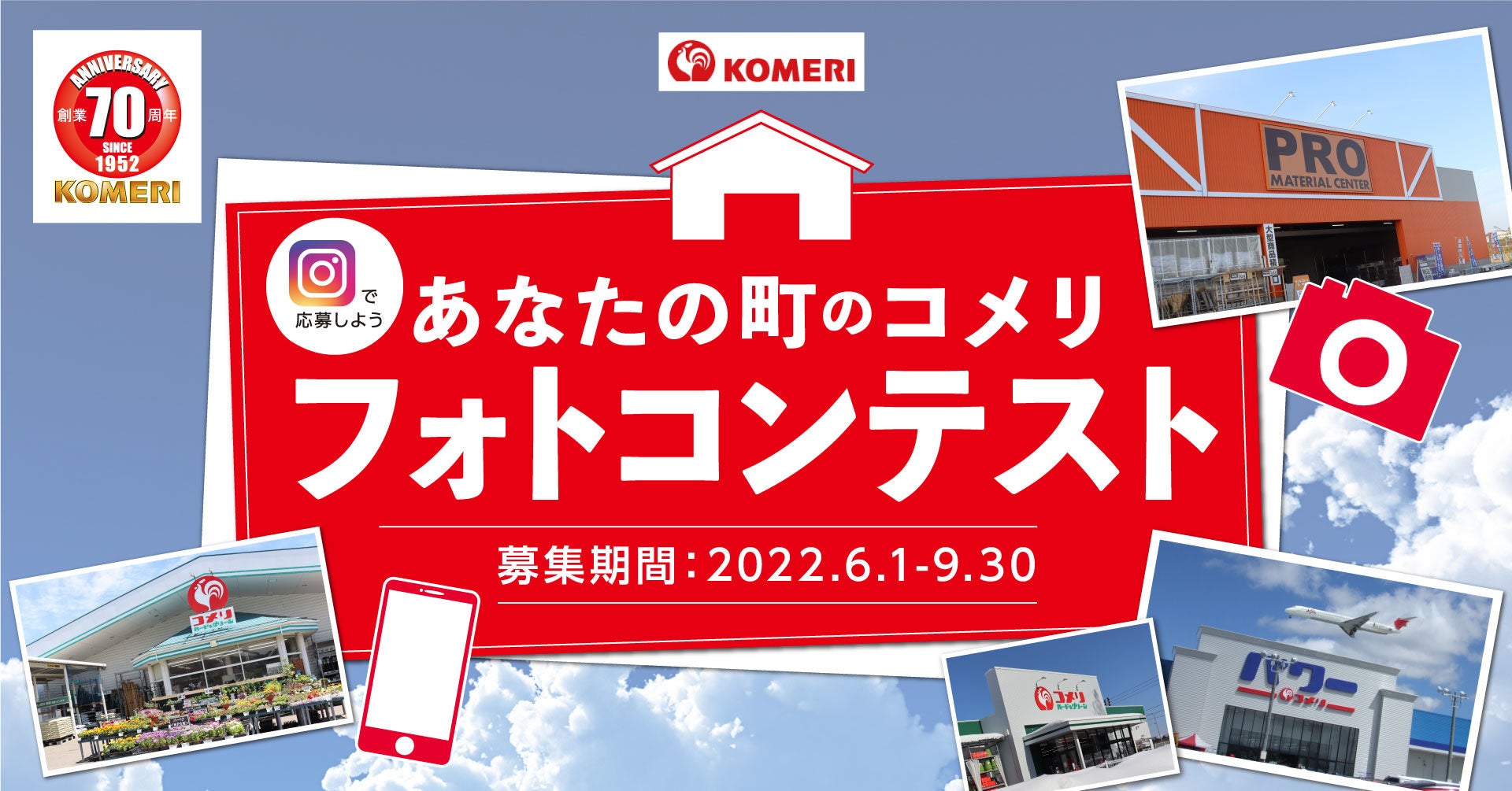 そこで、この度コメリの創業70周年を記念いたしまして「あなたの町のコメリ フォトコンテスト」を開催いたします。今回の応募テーマは、みなさまのお近くのコメリ店舗と風景写真、そして皆様のコメリにまつわる思い出です。ご応募いただいた方の中から抽選で70名様に新潟県産コシヒカリをプレゼントいたします。皆様からのご応募お待ちしております。