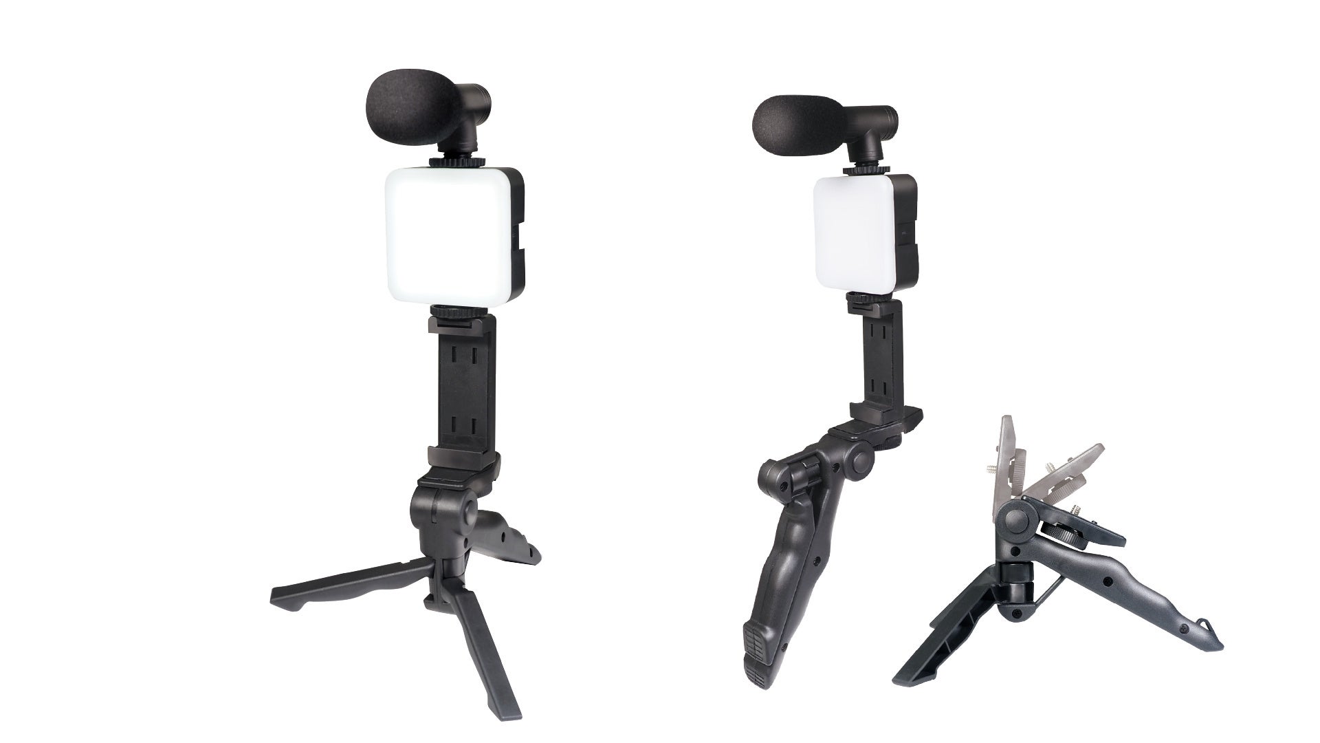 「LEDライト・マイク・三脚」が一体化。ライトは3段階調光が可能