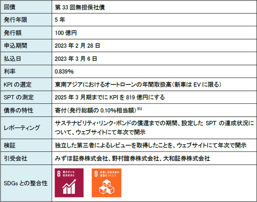 株式会社オリエントコーポレーション(東京都千代田区、代表取締役社長:飯盛 徹夫、以下:オリコ)は、国内市場において公募形式による「サステナビリティ・リンク・ボンド(第33回無担保社債、以下:本サステナビリティ・リンク・ボンド)」について、下記のとおり発行しましたのでお知らせいたします。