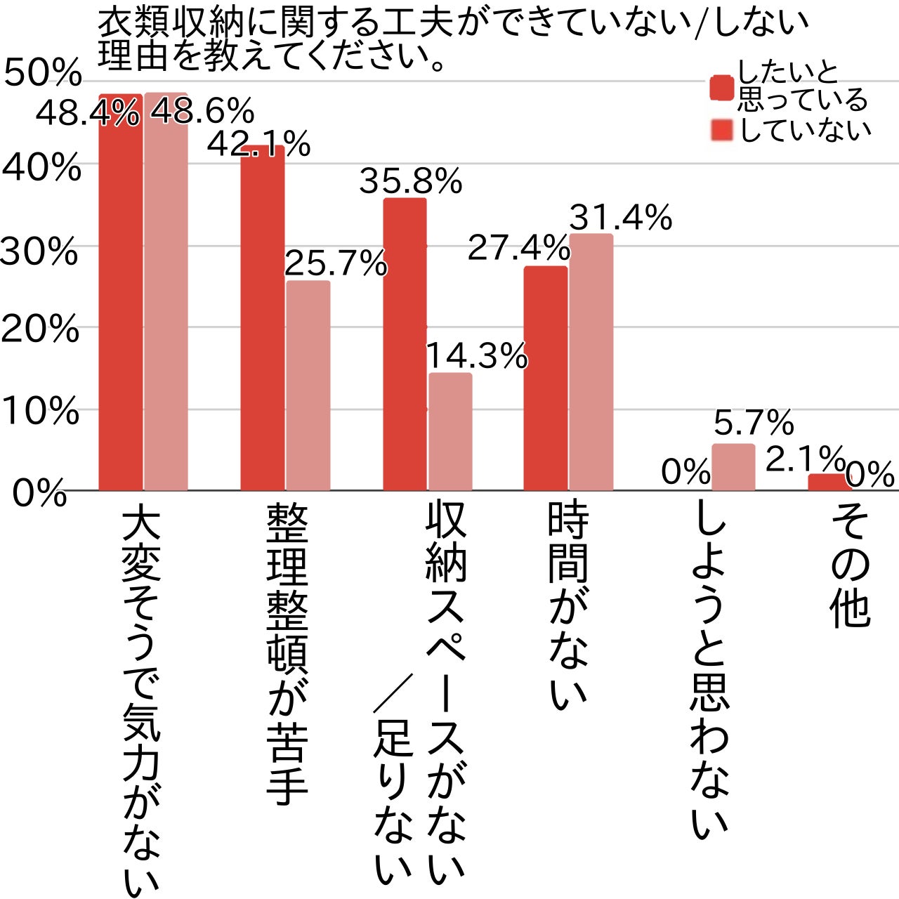 衣類収納の工夫をしたいのに時間・労力・衣類の多さ・収納スペース不足でできていない方が多く、衣類収納の工夫をしている方の中にも、衣類がなかなか減らせなかったり、収納スペースが足りずになかなかスッキリした状態にならないなどうまくいかないと悩む声が多々ありました。