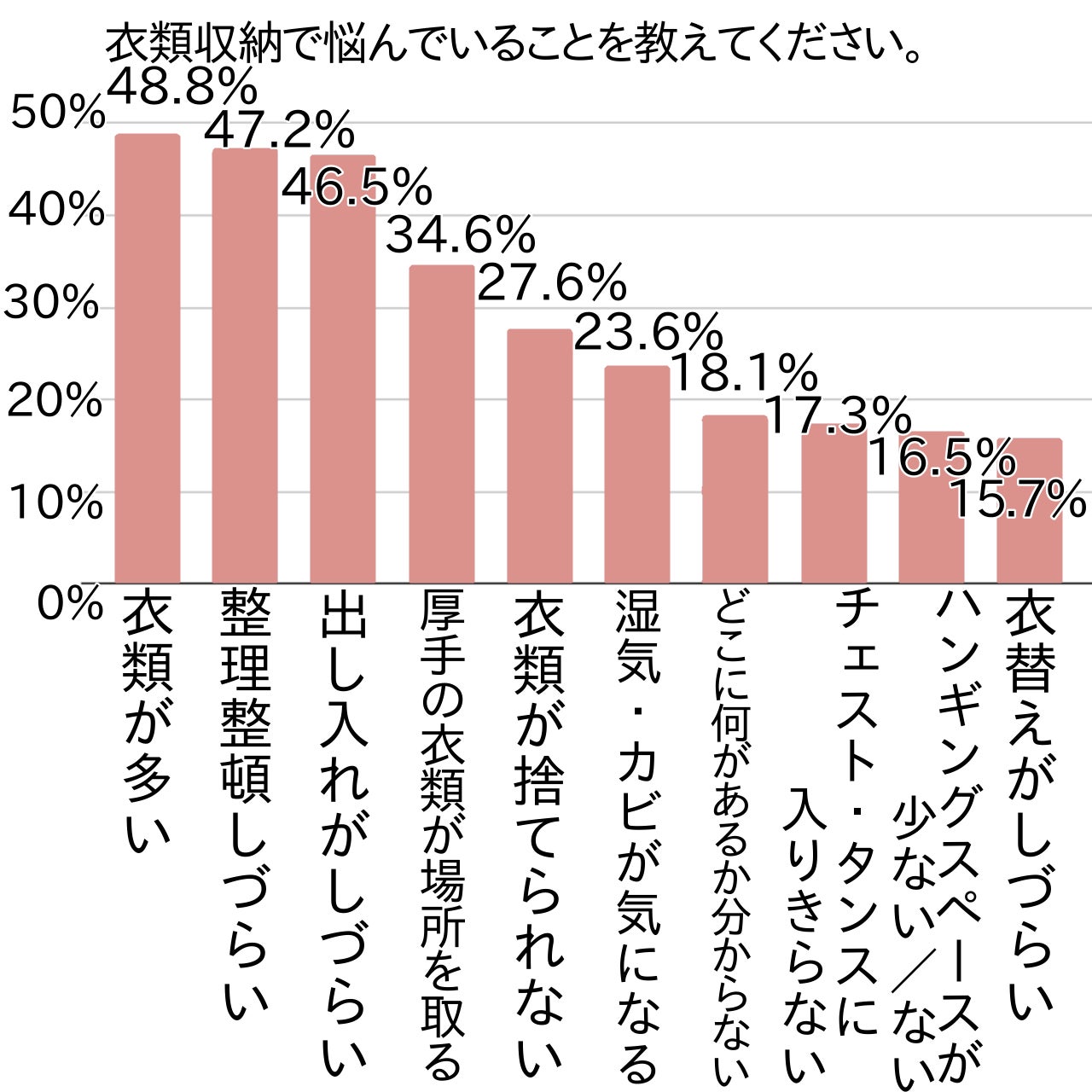 悩みを抱える方が非常に多い衣類収納について、具体的に悩んでいることを尋ねました。