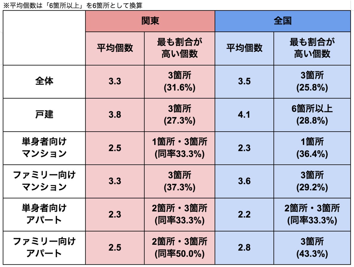 なお、全体として3箇所が多かった要因としては、今回の回答者の中で戸建・ファミリー向けマンション在住者が多めであったことが影響しています。