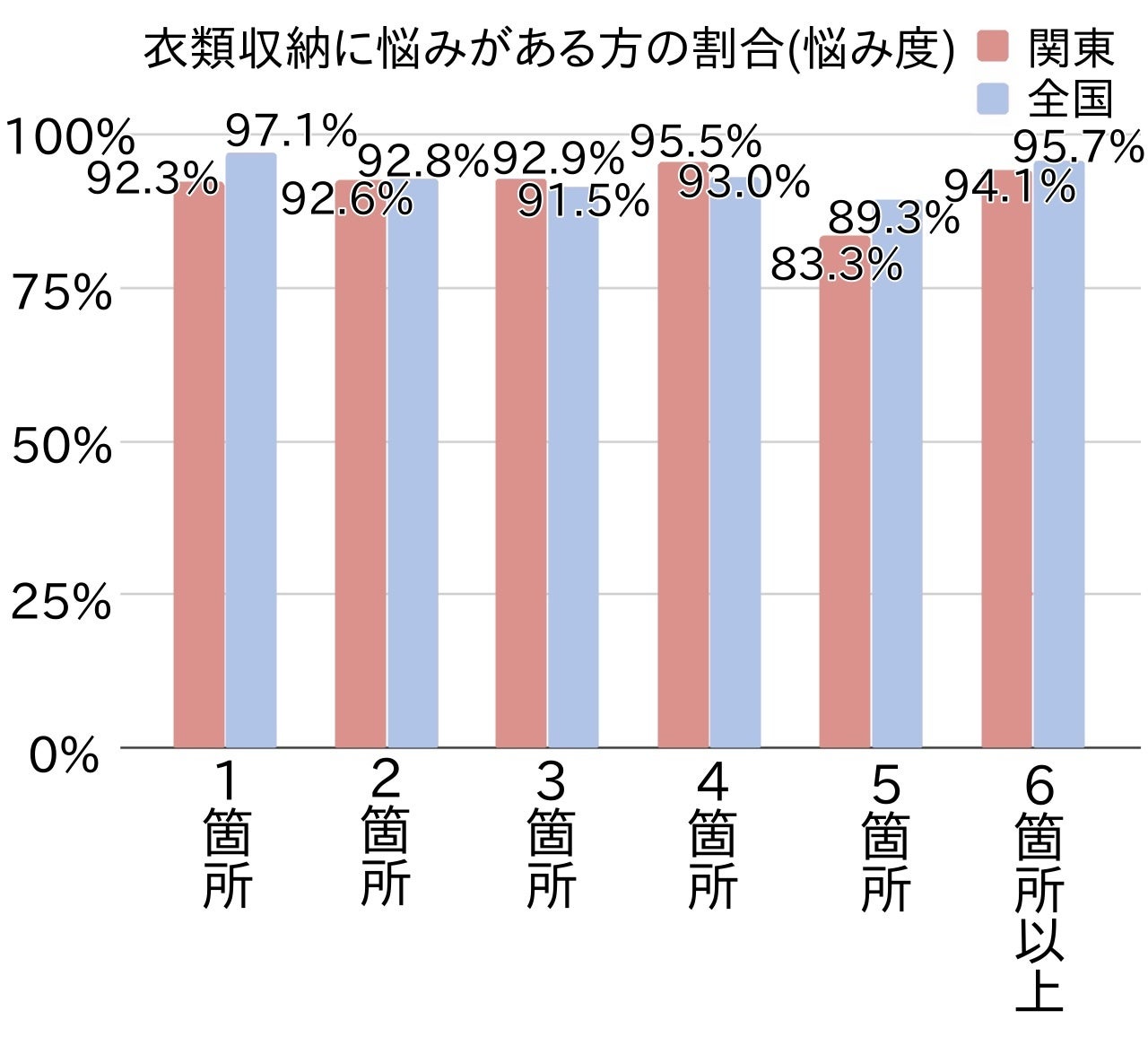 また、収納スペースの個数が上昇しても衣類収納の悩み度が下がる傾向は見られず、関東・全国とも5箇所で悩み度が最も低かったものの、6箇所以上になるとまた悩み度が上昇し、それぞれ2番目に高い悩み度でした(関東94.1%・全国95.7%)。