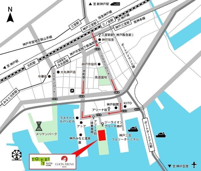 三宮駅前より神姫バスにて「アリーナ前」「ジーライオンアリーナ神戸」下車 徒歩すぐ