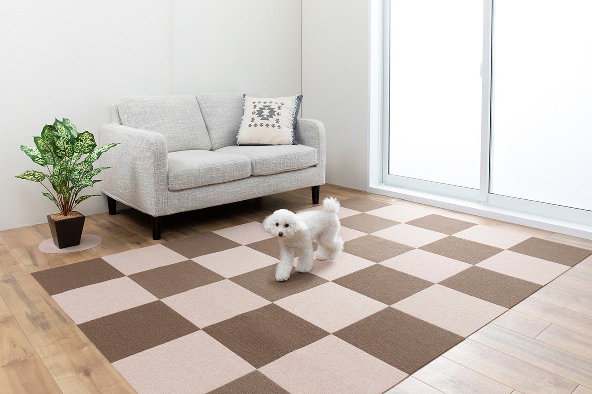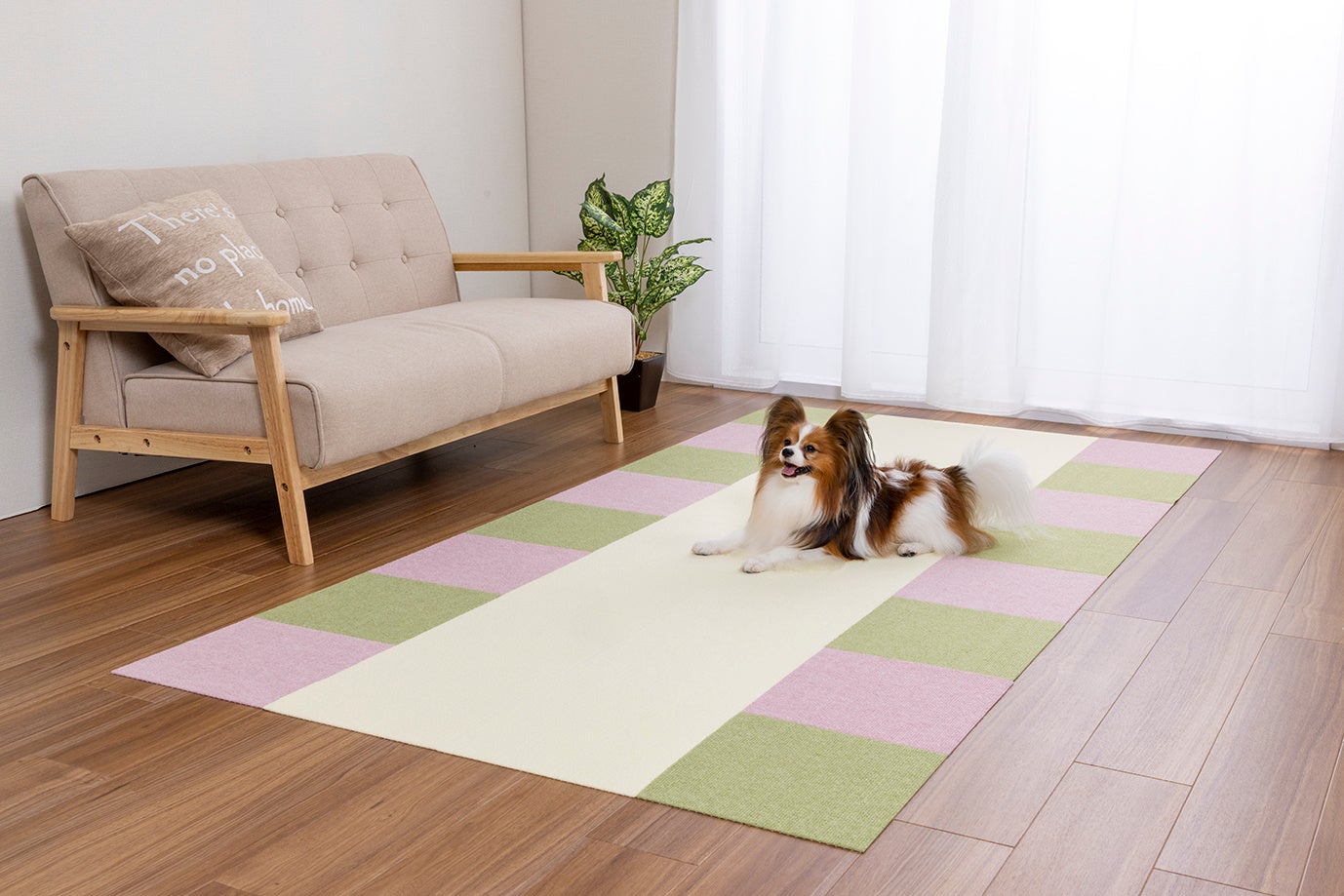 今回のイチオシ商品「おくだけタイルマット20枚入」は、表面に撥水加工を施したお手入れがラクなマットです。裏面は吸着素材で付け外し簡単!汚れた部分だけ外して洗濯できるので、繰り返し使えます。今回のイベントでは合計7色が販売されるので、ストライプ柄や格子柄などの好きな組み合わせで床をアレンジできます。