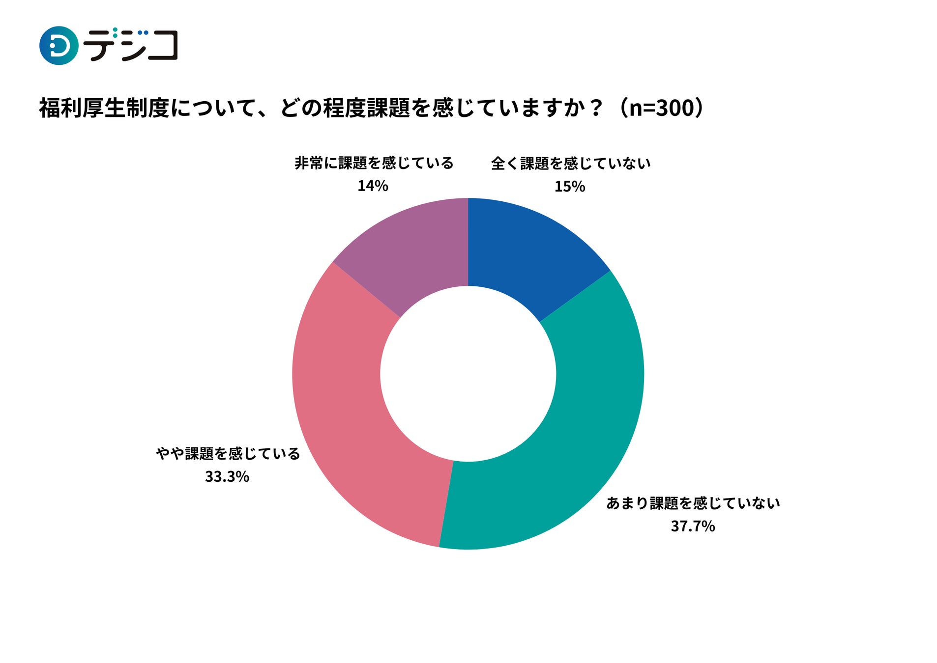 現在の福利厚生制度について、どの程度課題を感じているかを調査したところ、「全く課題を感じていない」と回答した企業は15.0%にとどまり、約半数の企業が課題を感じていることが明らかになりました。具体的な課題の内容については、次の設問で詳しく掘り下げていきます。