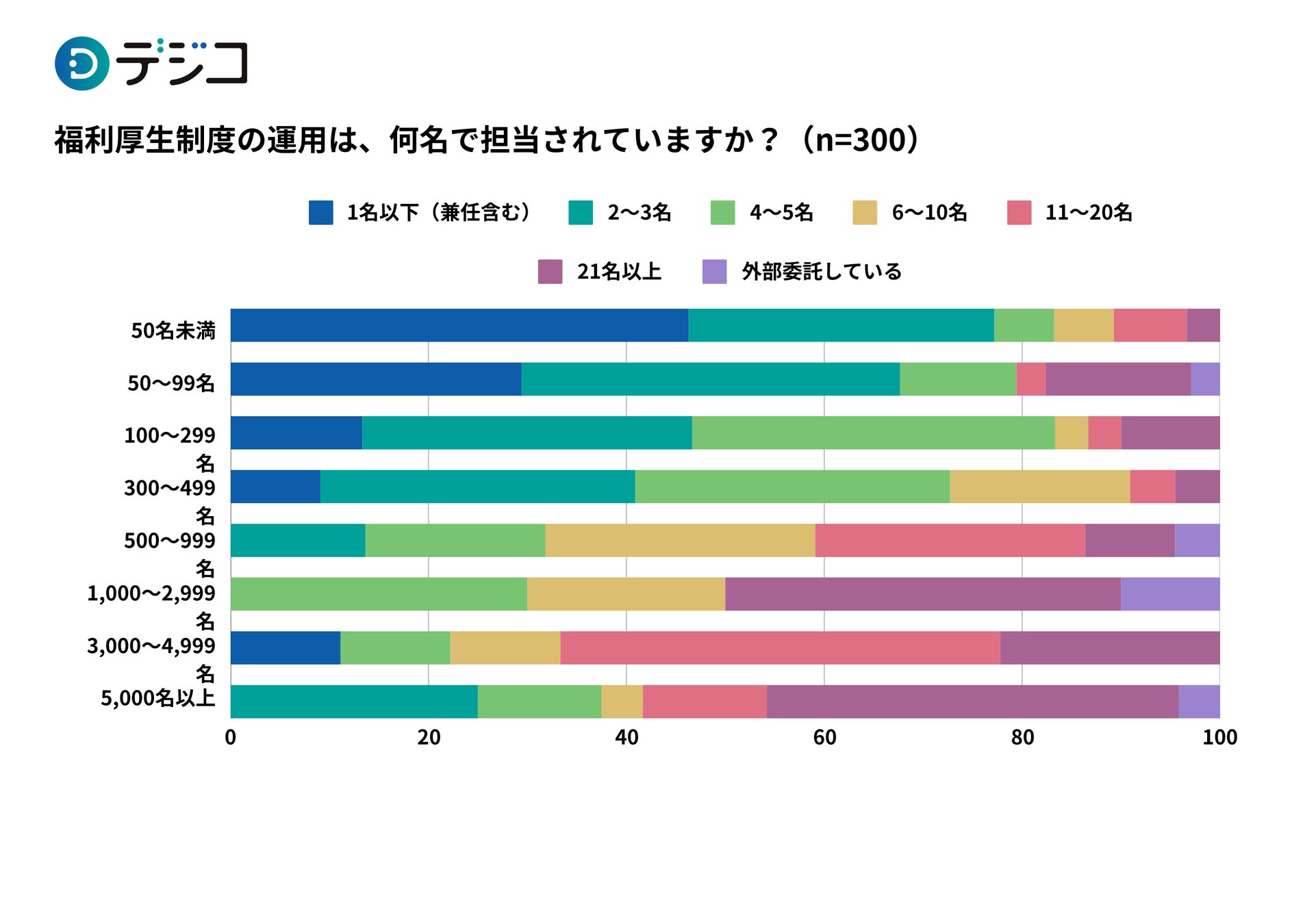 しかし、注目すべきは5,000名以上の規模の企業であっても、2~3名という少人数で福利厚生制度を運用している企業が2割以上存在していることです。従業員が多い企業では、福利厚生制度の運用はより複雑化し、担当者の負担も大きくなることが予想されます。限られた人員で効率的に業務を行うためには、業務負担の軽減が必要と考えられます。