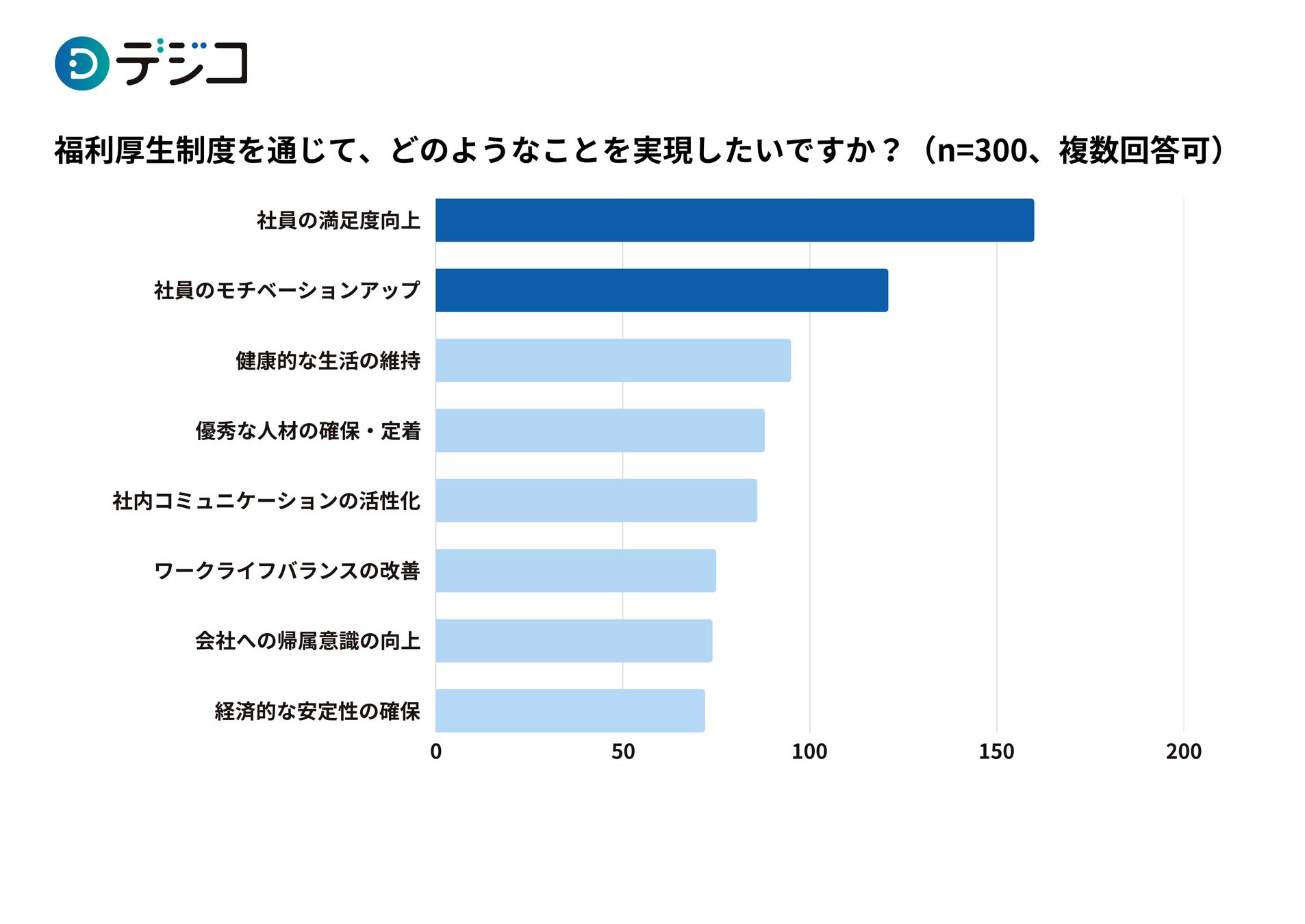 福利厚生制度や施策を通じて実現したいことを聞いたところ、「社員の満足度向上」と「社員のモチベーションアップ」が上位を占める結果となりました。