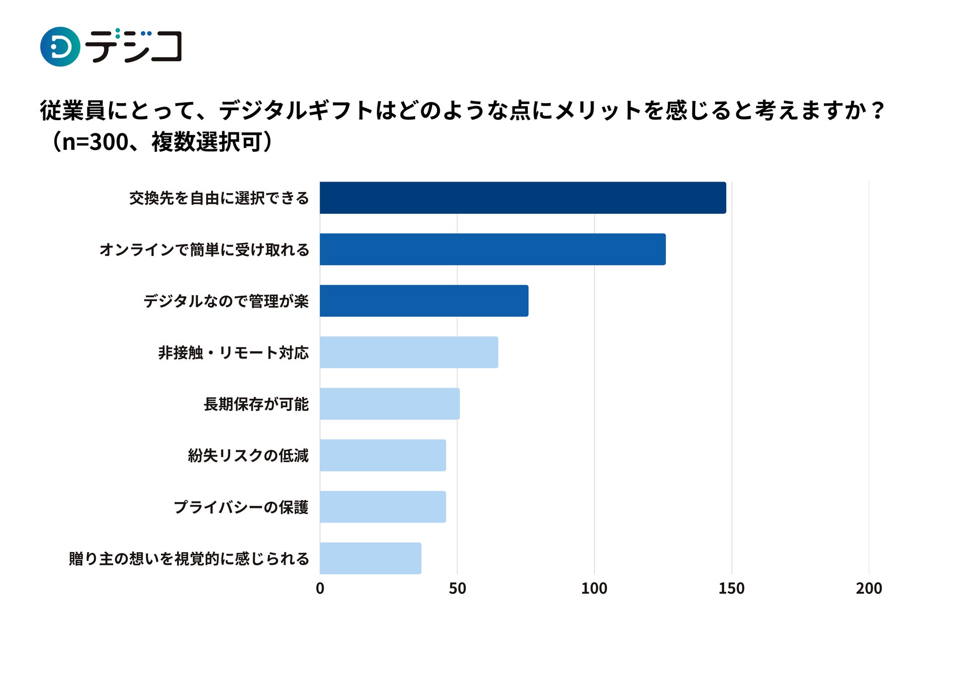 従業員にとって、デジタルギフトはどのような点にメリットを感じると考えるか聞いたところ、「交換先を自由に選択できる」、「オンラインで簡単に受け取れる」、「デジタルなので管理が楽」が上位を占めました。