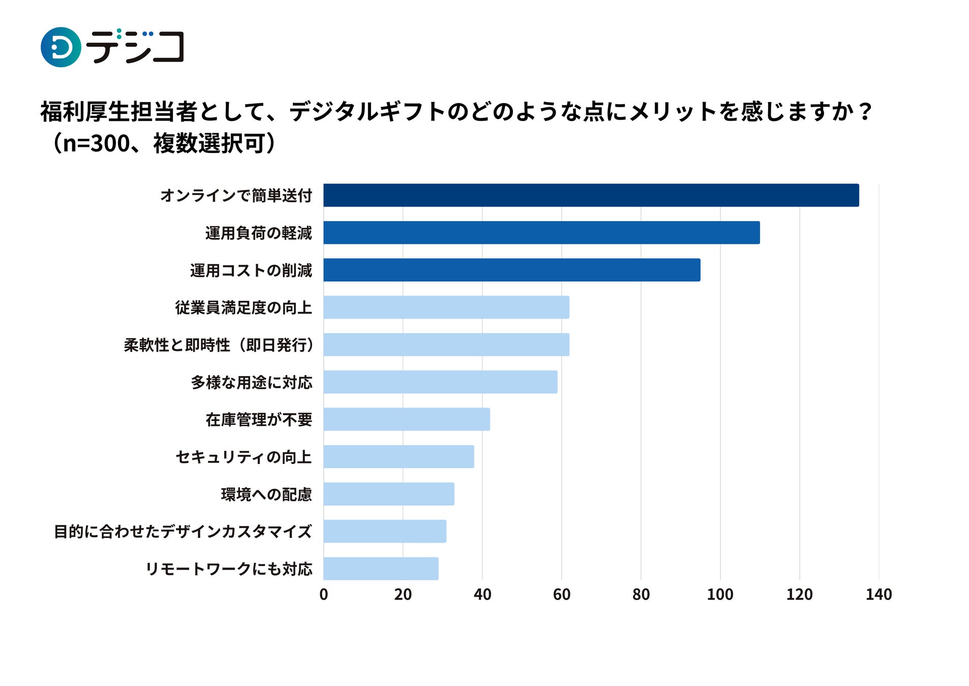 福利厚生担当者として、デジタルギフトのどのような点にメリットを感じるか聞いたところ、「オンラインで簡単送付」、「運用負荷の軽減」、「運用コストの削減」が上位を占めました。これらはまさに、前述の調査で明らかになった福利厚生の課題と合致します。