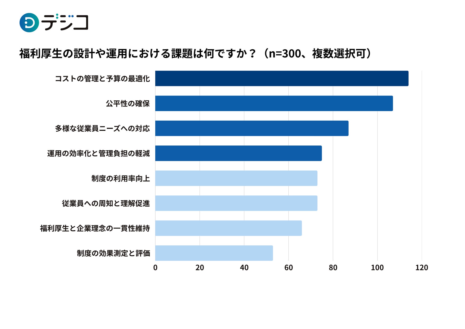 福利厚生の設計や運用における課題について聞いたところ、「コストの管理と予算の最適化」、「公平性の確保」、「多様な従業員ニーズへの対応」、「運用の効率化と管理負担の軽減」が上位を占めました。