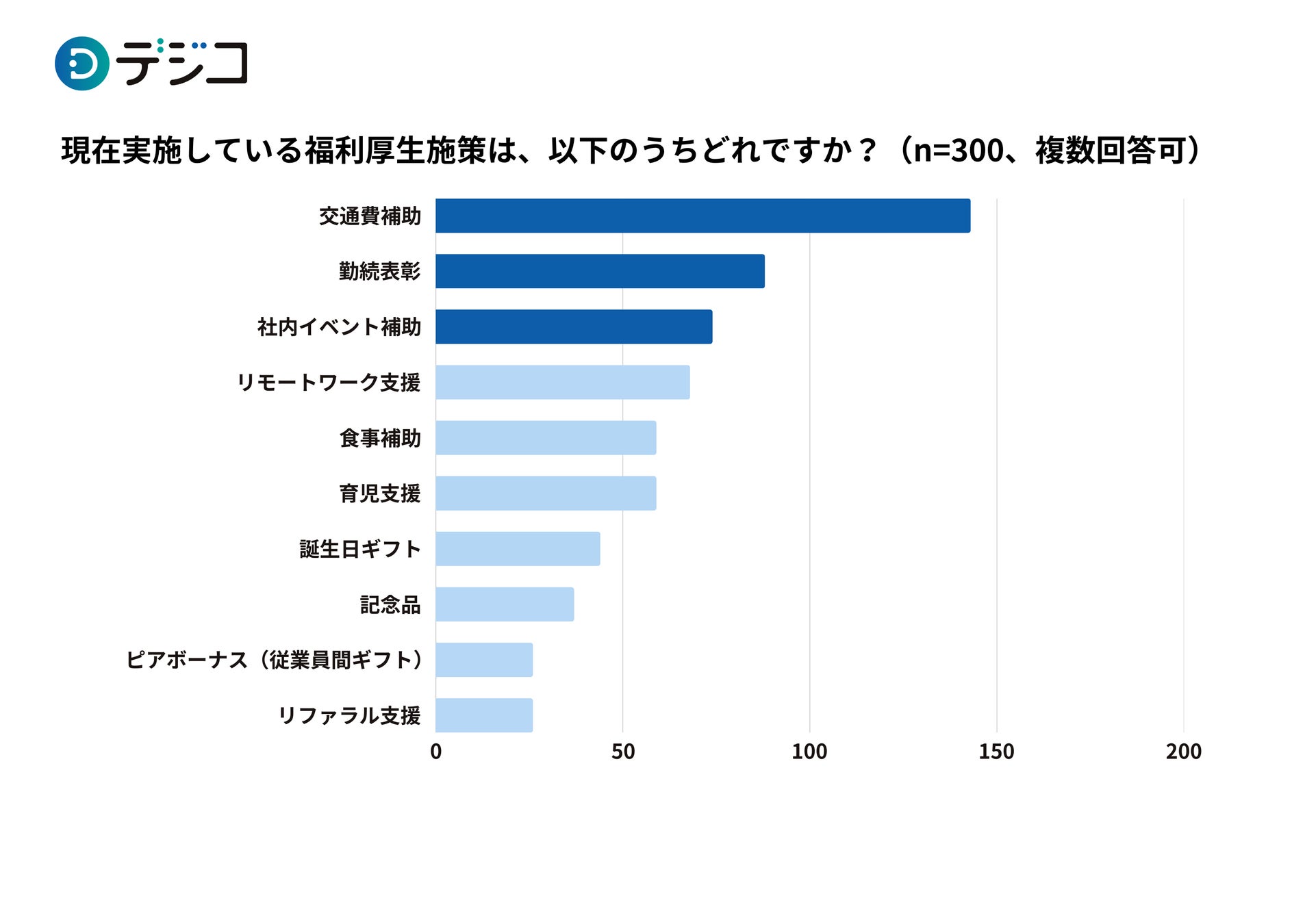 現在実施している福利厚生施策について聞いたところ、最も多かったのは「交通費補助」、次いで「勤続表彰」、「社内イベント補助」という結果になりました。