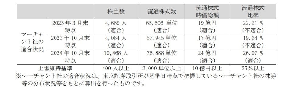 マーチャント社は、2023年6月30日付「上場維持基準への適合に向けた計画について」並びに2024年1月31日付「上場維持基準への適合に向けた計画に基づく進捗状況について(決算期変更に伴う計画期間の変更)」にて開示しましたとおり、スタンダード市場の上場維持基準に関しまして、「流通株式比率」だけが不適合となっておりましたが、2024年10月末日現在におきまして、「流通株式比率」を含む、すべての上場維持基準に適合いたしました。