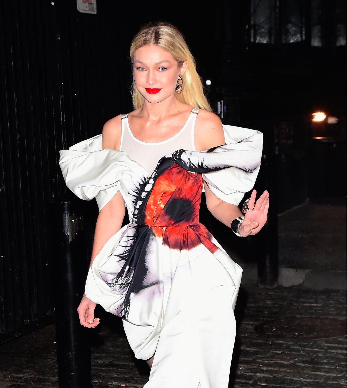 2月27日ニューヨークにて、ジジ・ハディッドが2023年春夏コレクションよりエンジニアードアイプリントを施したドレープが特徴的なドレス、イヤリングを着用しました。