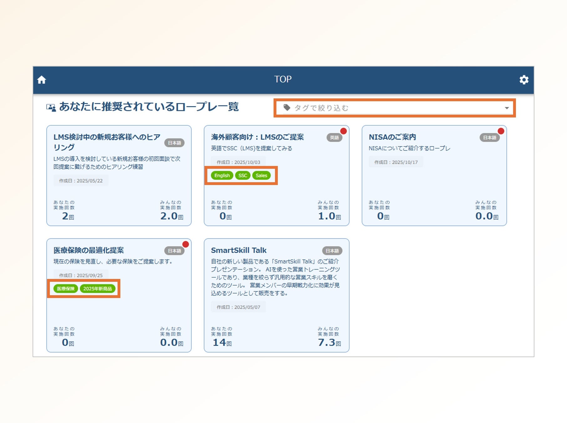 ロープレごとに「商材名」や「推奨年次」などのタグを設定可能です。ユーザーは登録されたタグを使ってシナリオを検索・絞り込みでき、自分に必要なトレーニングを即座に選択できます。