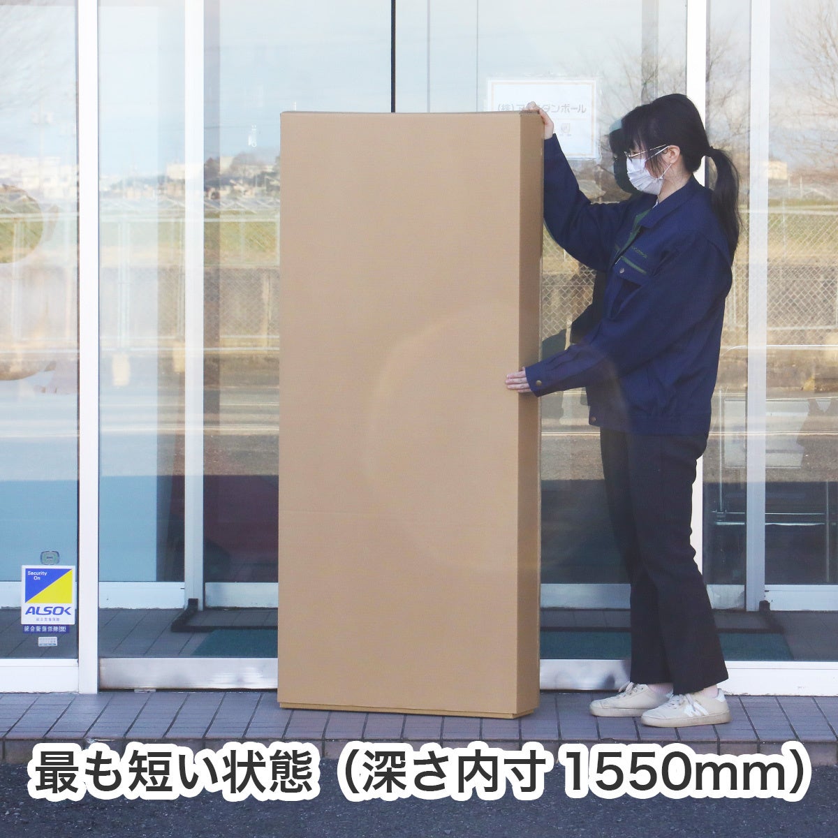 本体と蓋の2パーツ構成となっており、ダンボール同士が重なり合う部分をスライドすることで、深さ寸法を155cmから300cmまでの範囲で調整することが可能。