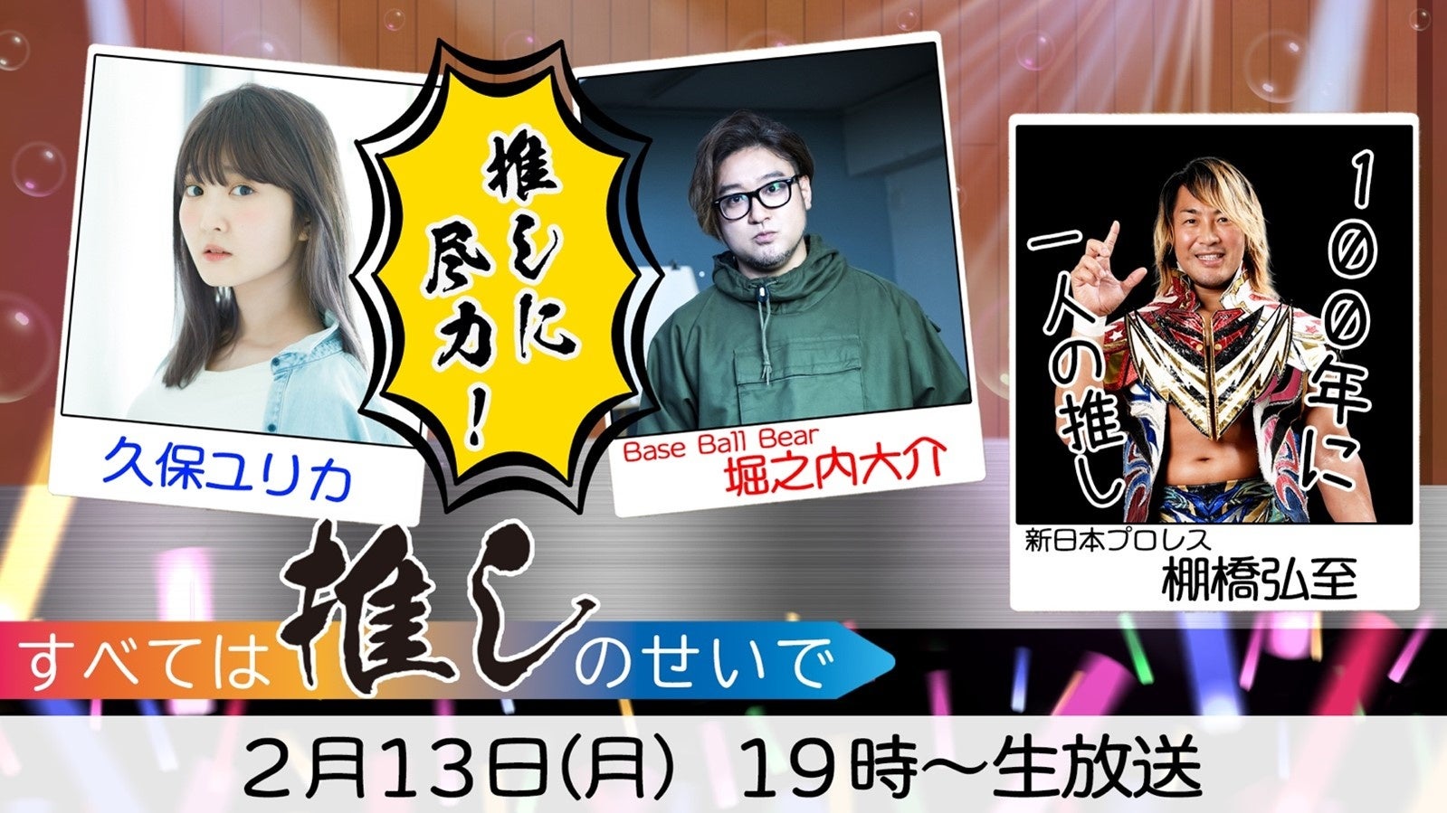 記念すべき第1回の放送は、2月13日(月)19時、堀之内大介にとって「100年に一人の推し」である、IWGP(インターナショナル・レスリング・グラン・プリ)ヘビー級王座最多戴冠記録保持者の棚橋弘至(新日本プロレス)がゲストとして登場します。どのような「推し」トークやサプライズ発表が飛び出すのか注目です。なお、本番組の無料パートは、ニコニコ公式生放送でも同時配信します。