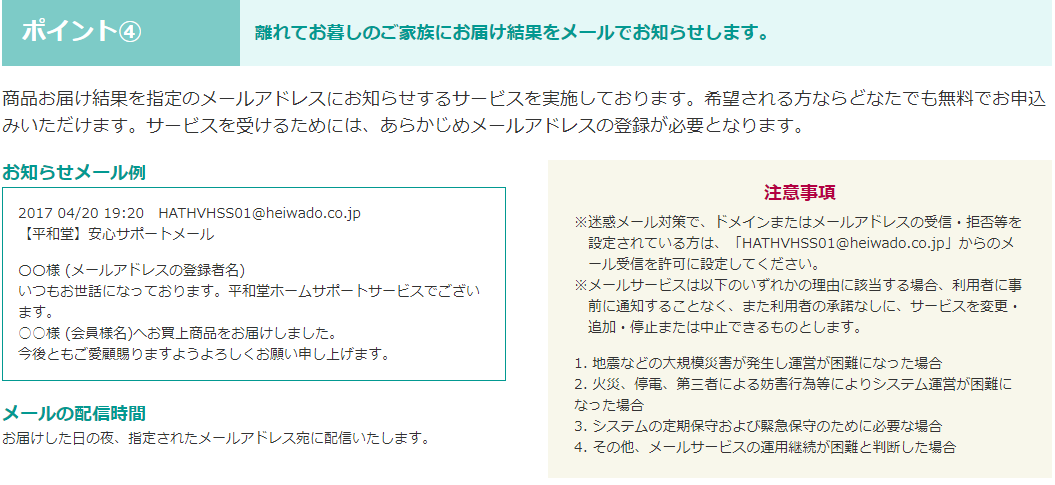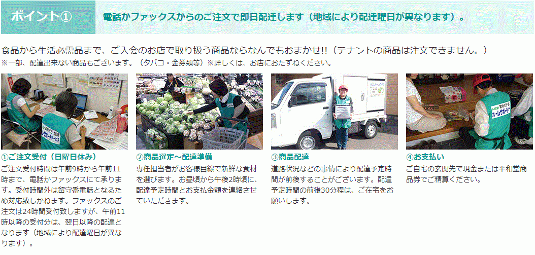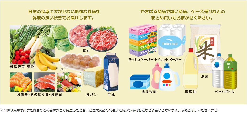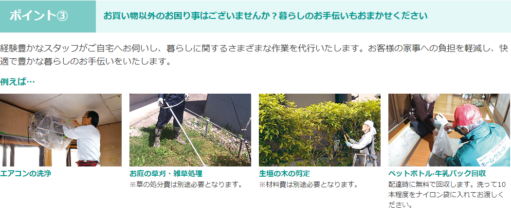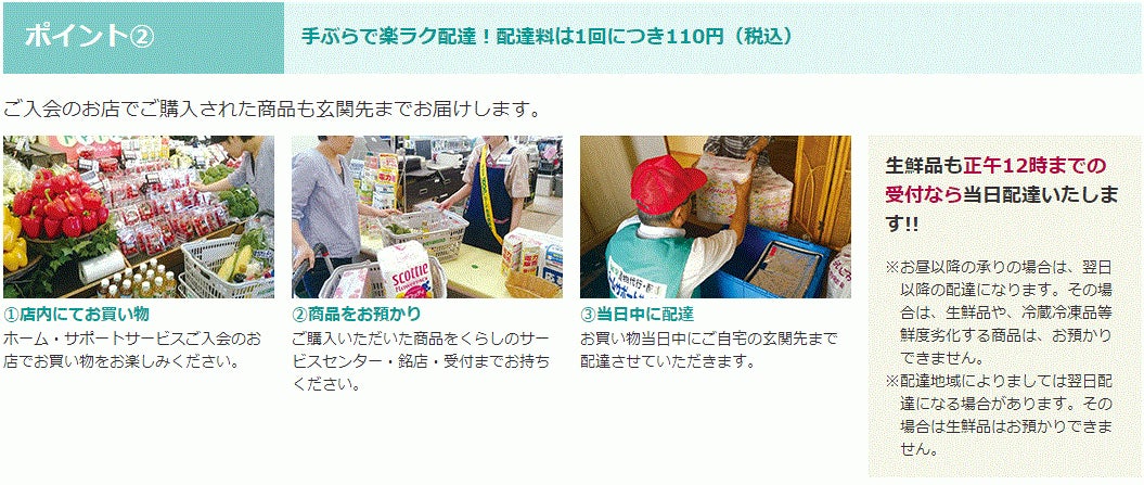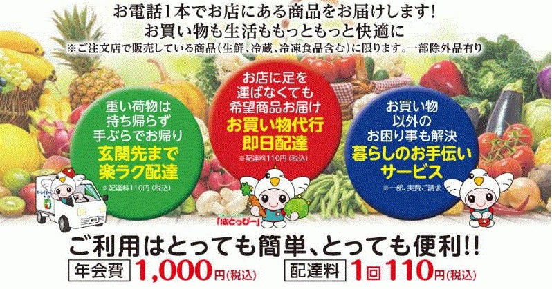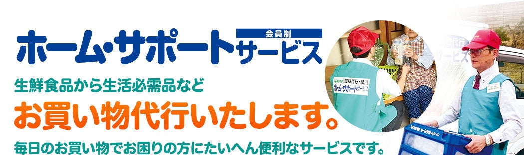 「お買い物代行」サービスは、どなた様にも安心して簡単にご利用いただけますよう、インターネットではなくお電話やファックスでご注文をお聞きしご自宅まで配達いたします。ご注文いただける商品は、店舗で販売している商品を中心にチラシ広告や会員様にお配りしている「ホーム・サポートサービス商品カタログ」からもご注文いただけます。また、店舗でお買い上げいただいた商品を当日配達する「手ぶらで楽ラク配達」サービスや暮らしに関する軽作業を請け負う「暮らしのお手伝い」など、サービス内容の順次拡大をすすめています。
