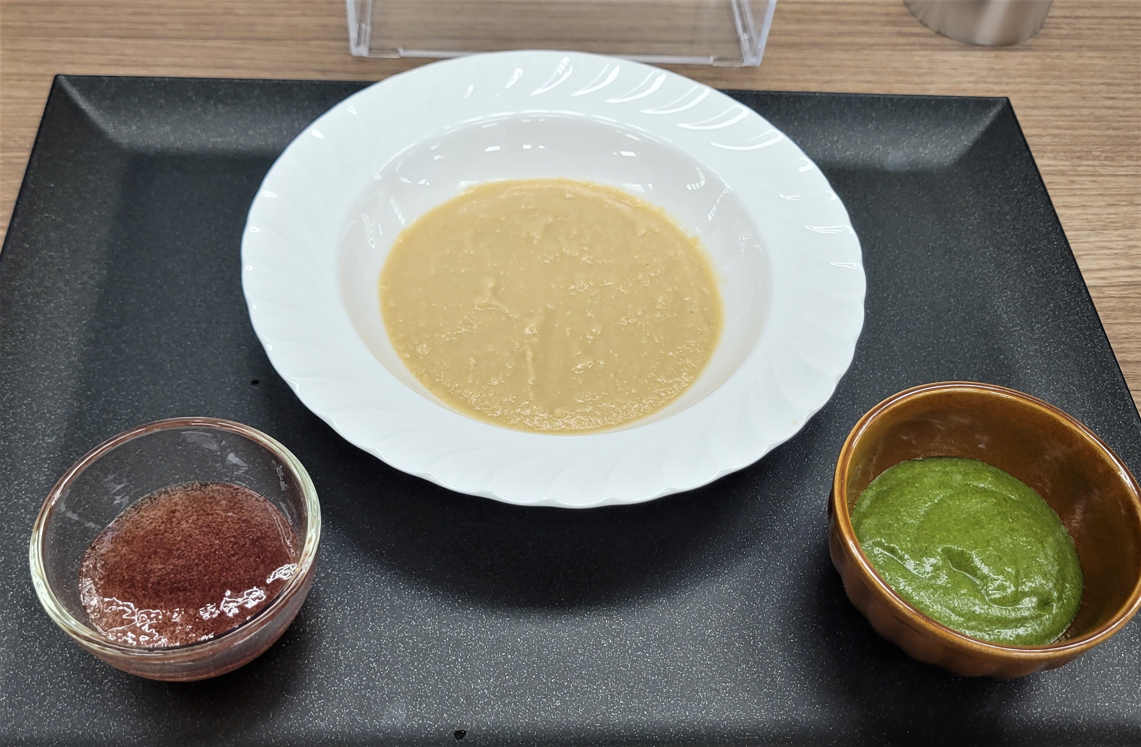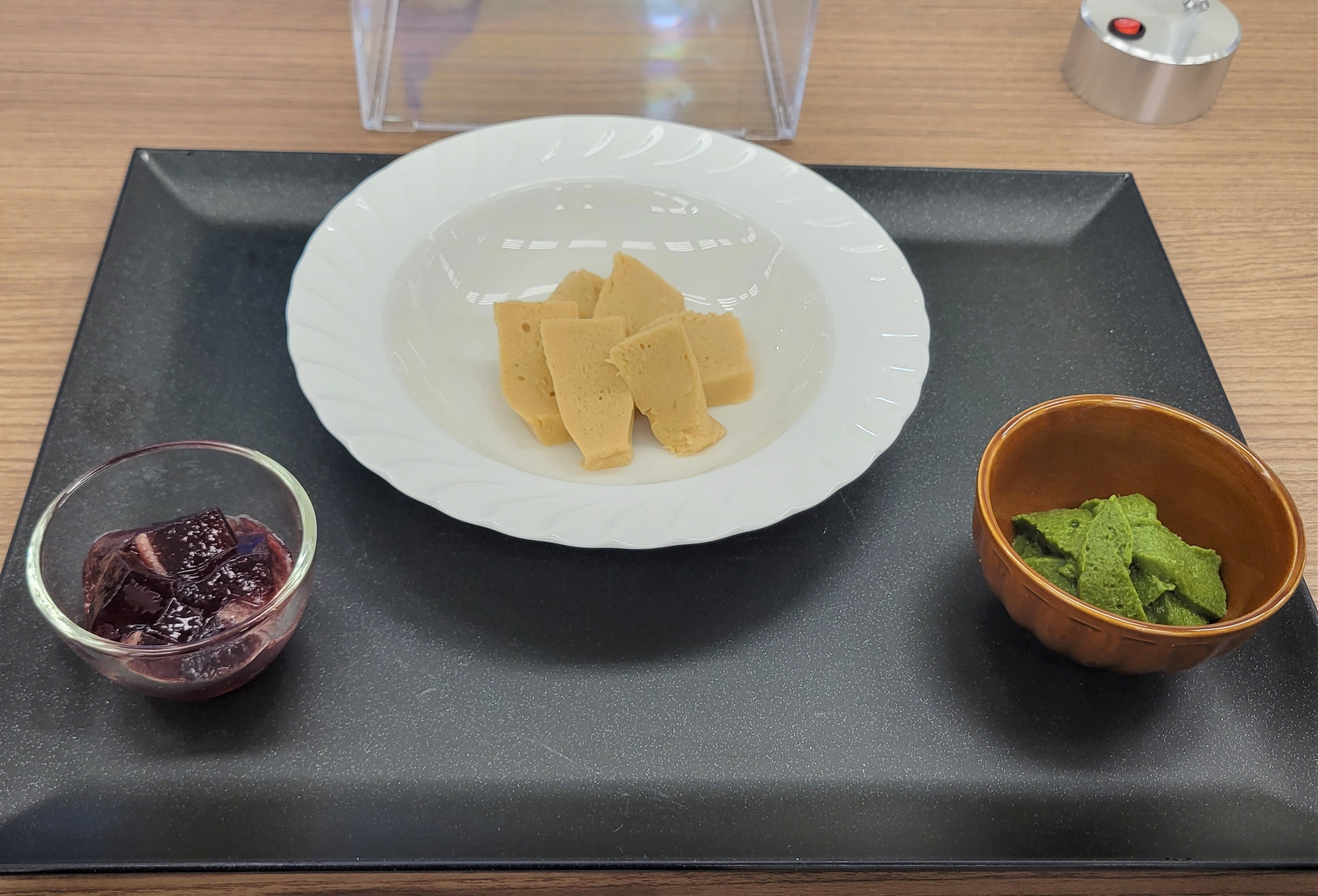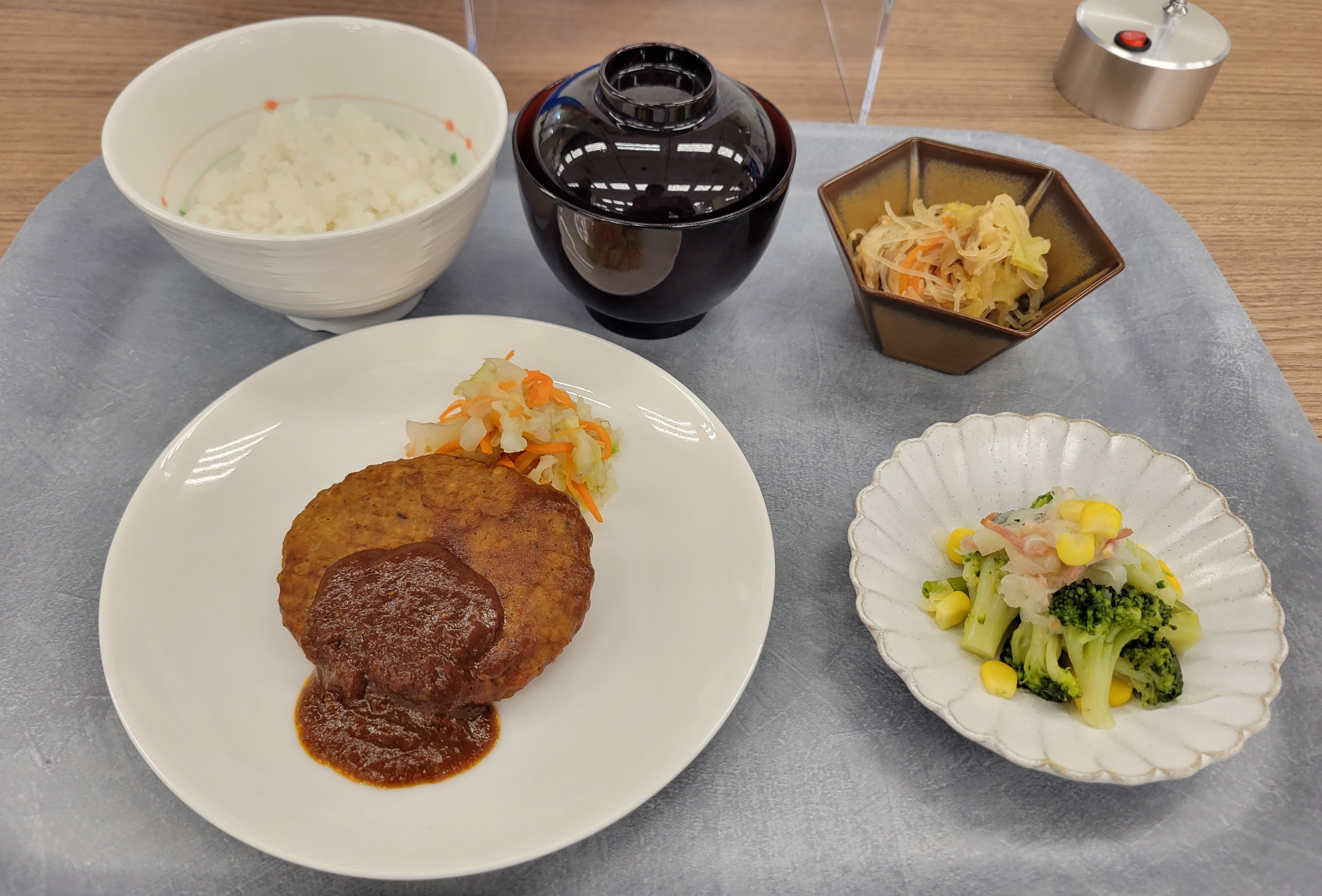科学的根拠に基づいたLEOCならではの調理法で作るオリジナルメニュー(一日の献立てをイメージ)として、朝食「アンサンブルエッグ 根菜サラダ」をはじめ、昼食「鯖の塩焼き さつまいもミルクバター 菜の花の辛し和え」、夕食「ハンバーグ 緑豆春雨のチャプチェ ブロッコリーのソテー」などを展示。その他には、形態食(ソフト食、ミキサー食)のサンプルなどを展示中です。