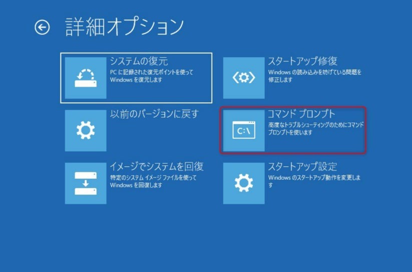 - Windowsセットアップウィザードで、「コンピューターの修復」―「トラブルシューティング」―「詳細オプション」―「コマンドプロンプト」を選択する。