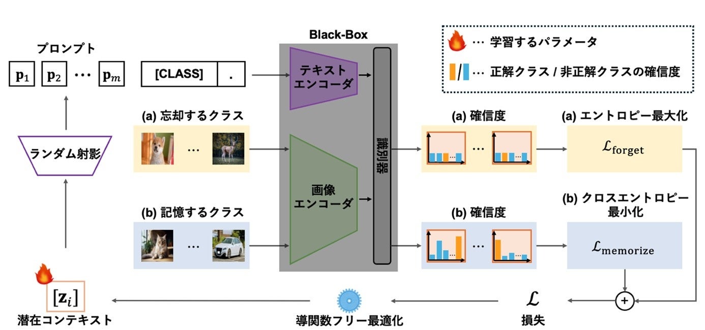 東京理科大学大学院 工学研究科 情報工学専攻の桑名 優輔氏(修士1年)、後藤 優太氏(修士2年)、東京理科大学 工学部 情報工学科の入江 豪准教授、日本電気株式会社の柴田 剛志博士の研究グループは、現代人工知能の基礎となっている大規模事前学習済み視覚-言語モデル(Vision-Language Model: VLM)に対し、そのモデルの構造やパラメータが未知であることを仮定する「Black-Box条件下」において、モデルが認識可能なクラスのうち、任意のものだけを認識できないように“忘却”させる手法を世界で初めて提案しました。不要な知識を“忘却”させることができれば、不要な情報がモデルから漏洩するリスクを低減したり、必要な機能についてのみ大規模モデルと同等の性能を発揮できる、より軽量かつ効率的な新しいモデルを構築できる可能性があります。