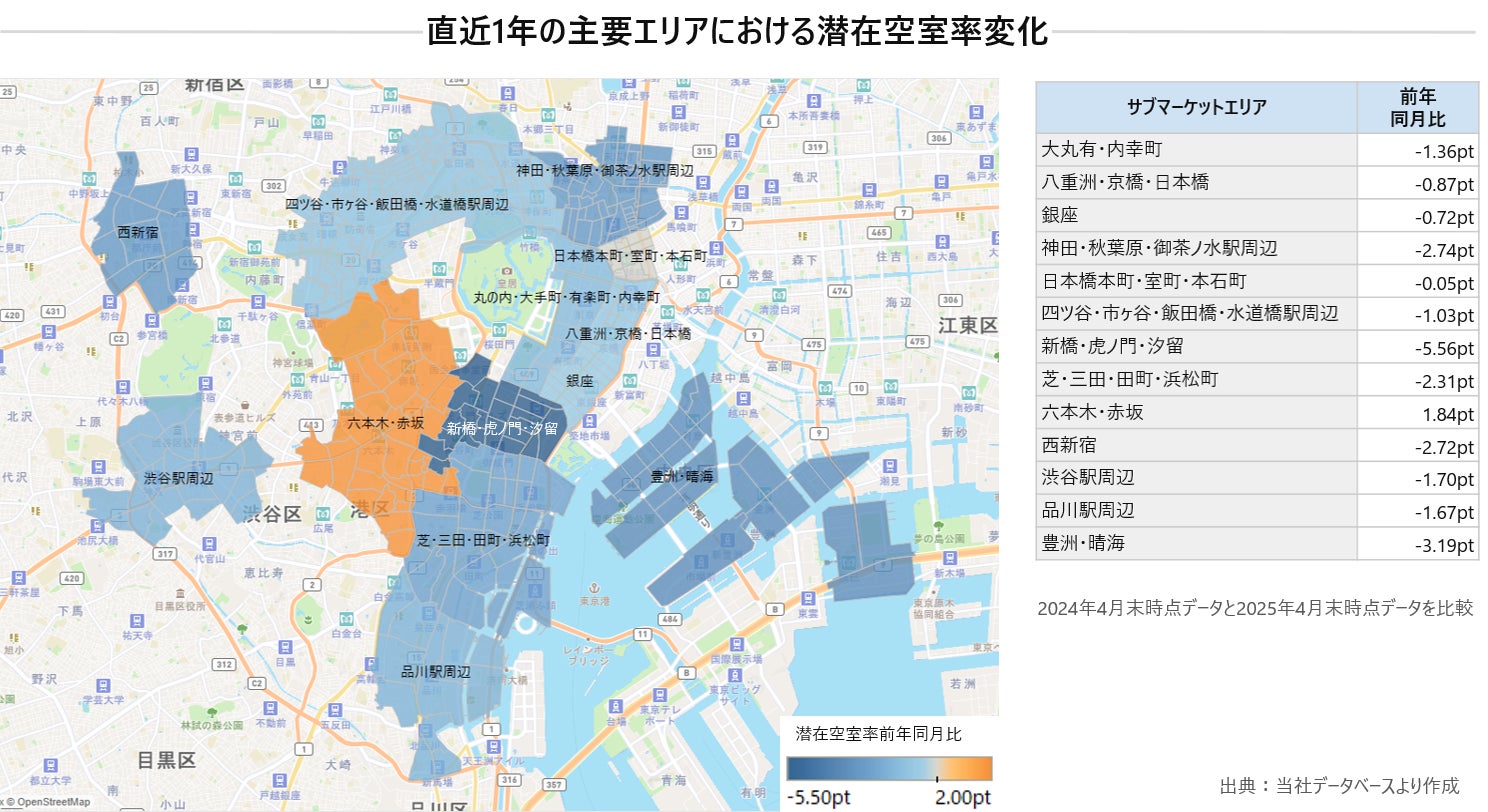 主要13エリアの潜在空室率を2024年4月末時点と2025年4月末時点で比較すると、六本木・赤坂エリアを除き低下している。