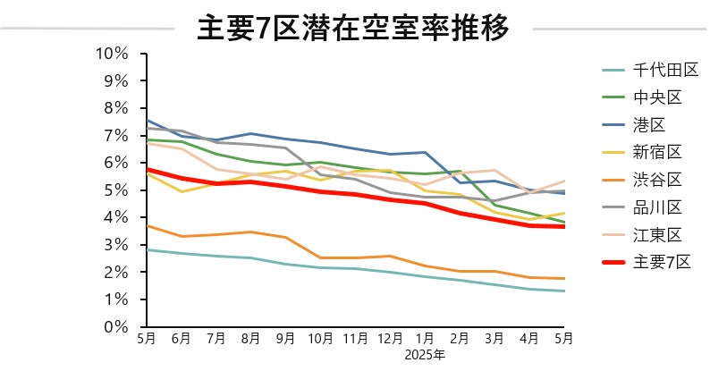 主要7区の空室率は3.65%で前月比-0.04pt。