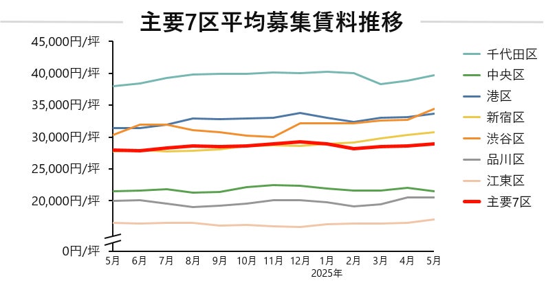 主要7区の平均募集賃料は28,862円/坪 前月比:+219円/坪