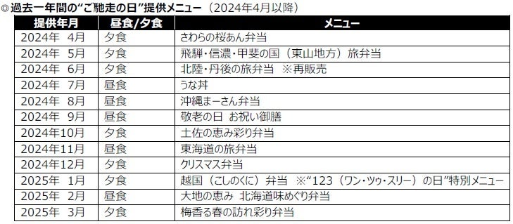 当社では、栄養バランスが整った食事を摂ることによる“体の栄養”に加え、“心の栄養”につながる取り組みとして、“ご馳走の日”を月に1回設けています。“ご馳走の日”には、各地域の食材やご当地メニューなどを取り入れた特別メニューを、通常のお弁当(普通食)と同じ577円(税込・おかずのみ)で提供。普段はなかなか食べる機会の少ない食材やメニューで、利用者が届くまでの待ち遠しさや誰かに自慢したくなる気持ちを感じられるお弁当になるよう心掛けています。
