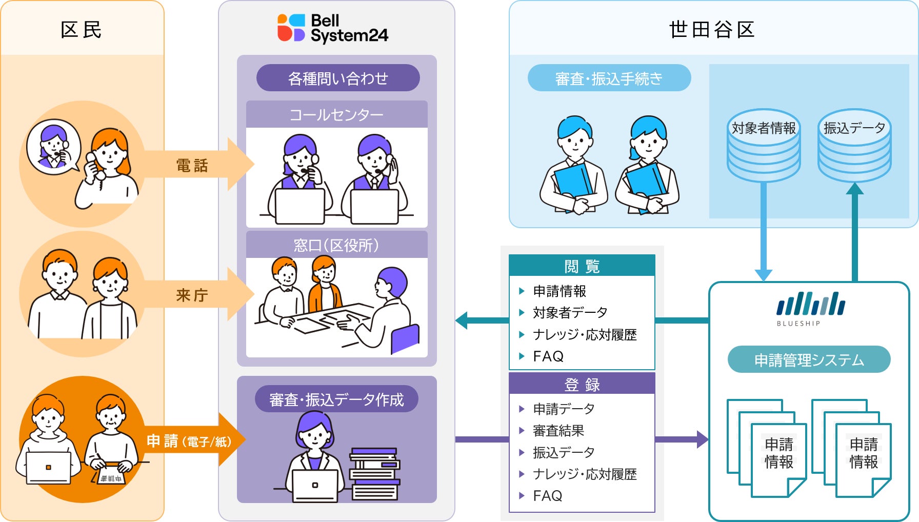 行政サービス手続きのDXなど幅広い自治体向けの支援サービスを展開する株式会社Blueship(本社:東京都渋谷区、代表執行役社長:杉﨑 恵悟、以下:Blueship)は、東京都世田谷区の「住民税非課税世帯等への価格高騰重点支援給付金」に関する事業(以下:本事業)を受託し、40年にわたり幅広い業界のコンタクトセンター・BPO(Business Process Outsourcing)の業務設計・運用実績を持つ株式会社ベルシステム24(本社:東京都港区、代表取締役 社長執行役員:梶原 浩、以下:ベルシステム24)とともに、電子申請・審査・承認の一連のワークフローや申請者からの問い合わせ管理等を一体的に支援します。本事業は、2024年5月に発表した、Blueshipとベルシステム24の業務提携締結後初の取り組みとなります。
