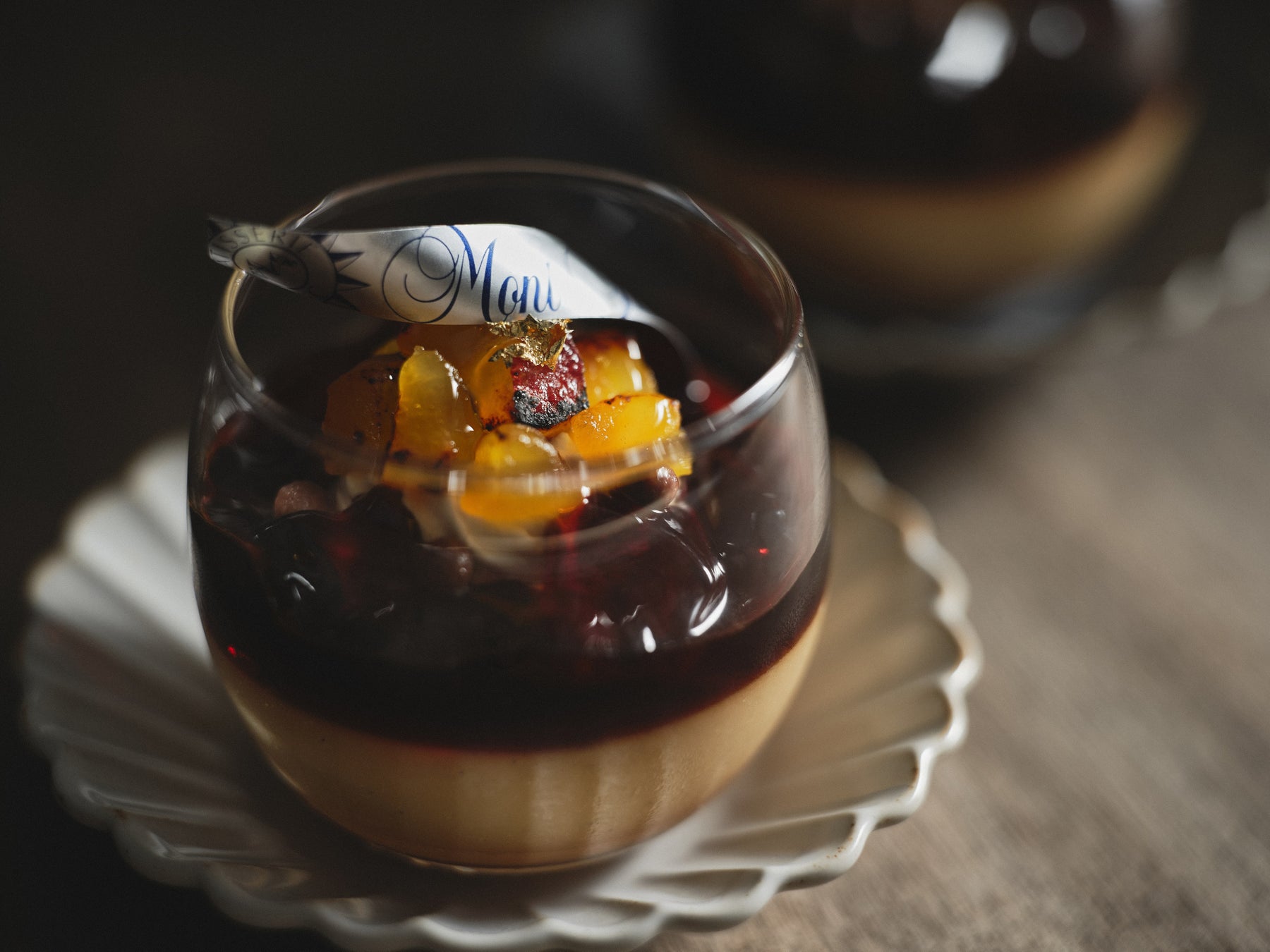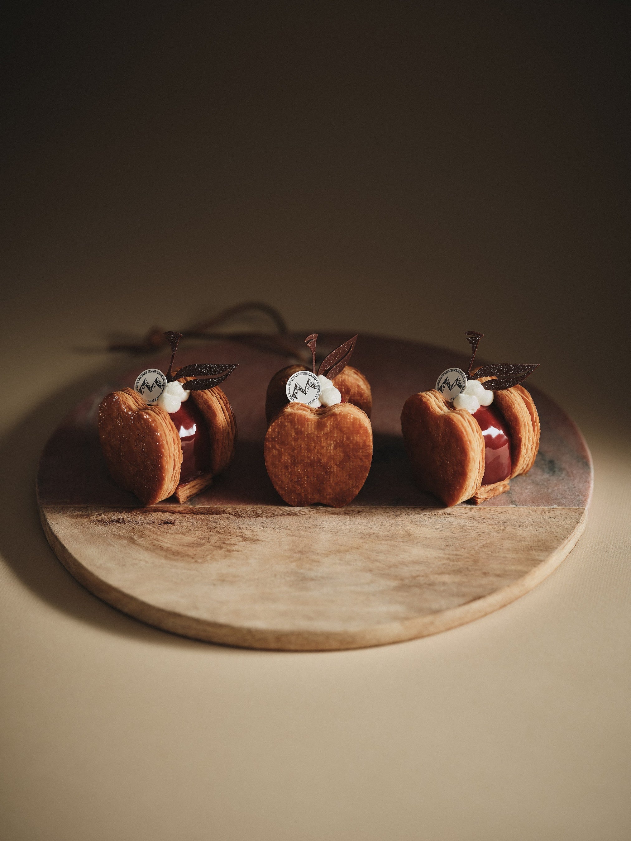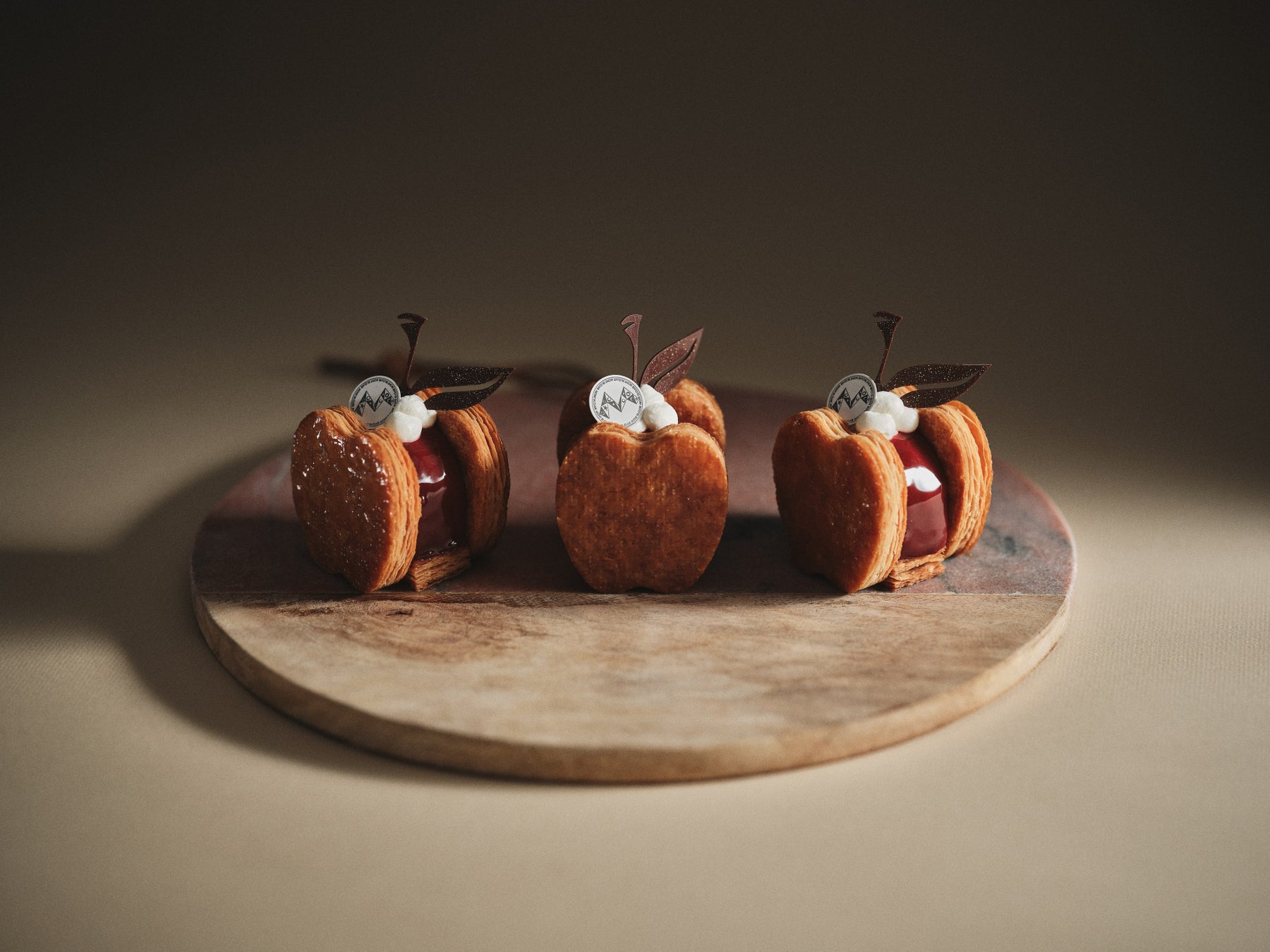 林檎のジュレ、キャラメルムース、カモミールと林檎ピューレを合わせたマスカルポーネムースを