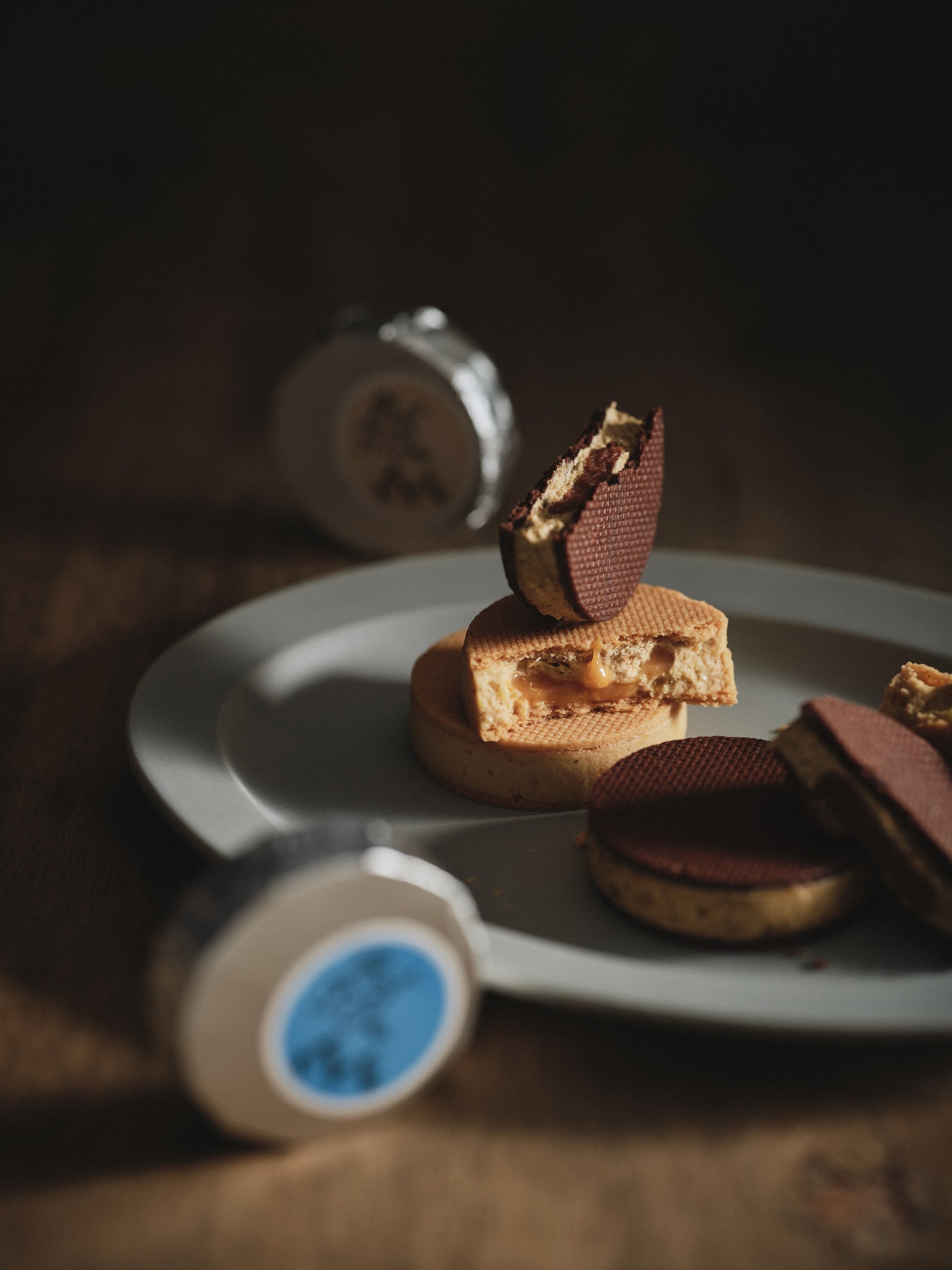 利平栗のクリームと柚子のキャラメルをサクサクのクッキーでサンド。