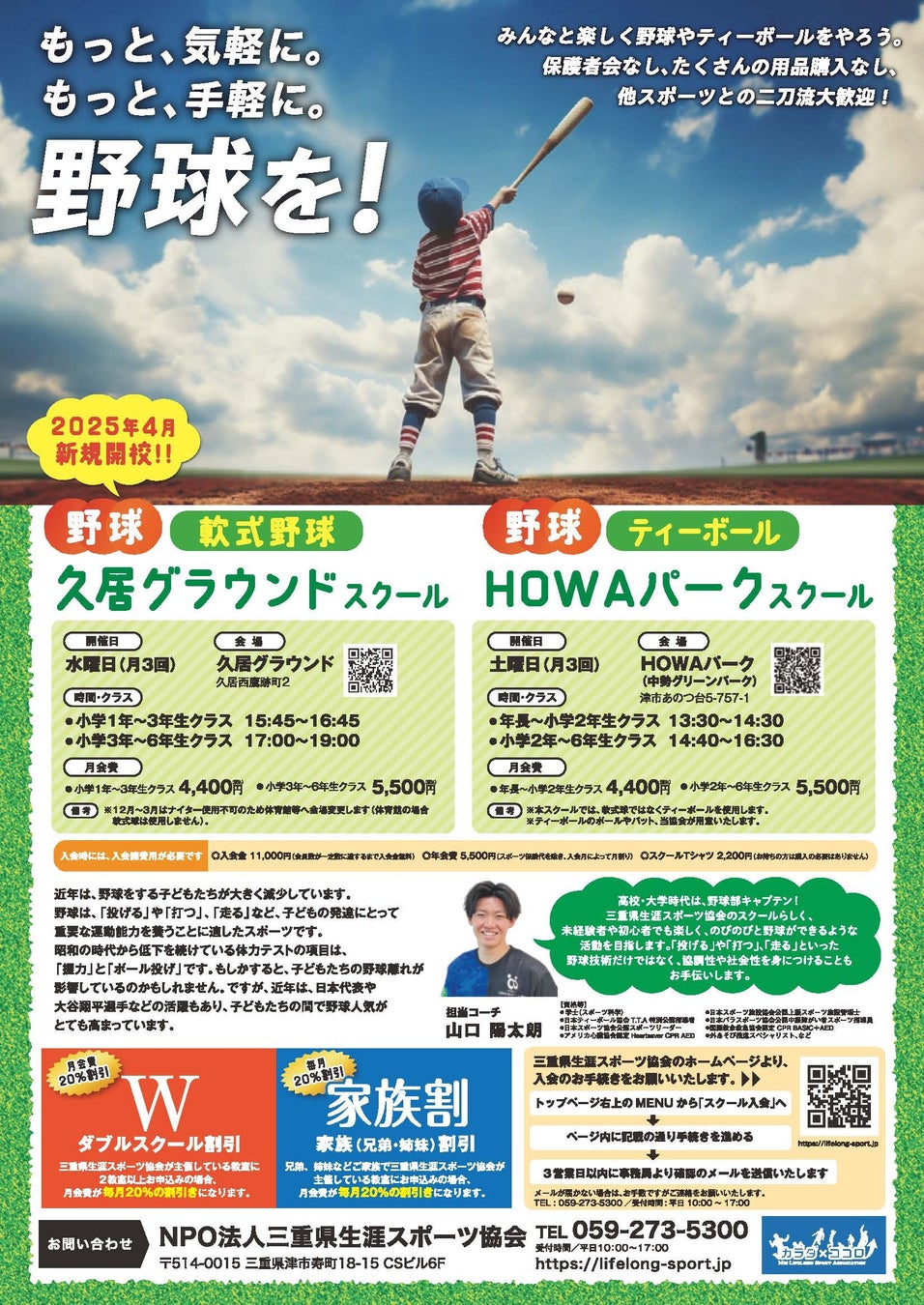 特定非営利活動法人三重県生涯スポーツ協会(三重県津市、理事長 竹田昌平)が運営する野球スクールの2会場目となる「野球(軟式野球)久居グラウンドスクール」が2025年4月新規開校することをお知らせします。