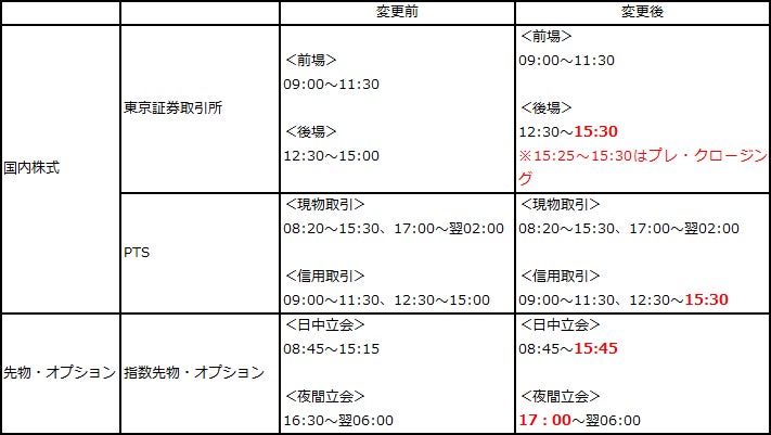 松井証券(以下「当社」)は、次期売買システム(arrowhead4.0)稼働に伴う東京証券取引所(以下「東証」)の取引時間変更に合わせて、2024年11月5日(予定)より、東証およびPTS、先物・オプション(デリバティブ市場)等の取引時間の延伸をおこないます。