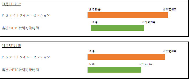 これにより、当社におけるPTSナイトタイム・セッションと、取次先である「ジャパンネクスト PTS(J-Market)」の取引開始時間が同一になり、17時*1から26時までお取引いただくことができます。なお、26時まで取引できるのは当社のみ*2となります。