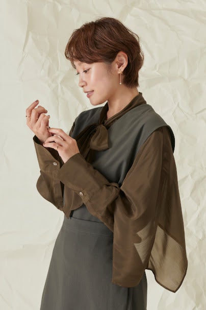 上品な透け感と光沢感が特徴のブラウス。アシンメトリーなケープは巻き方次第でコーディネートの表情がかわり、大人の女性の魅力を引き出す優美なマルチウェイアイテムです。バッグにアクセサリーとして巻くのもおすすめです。