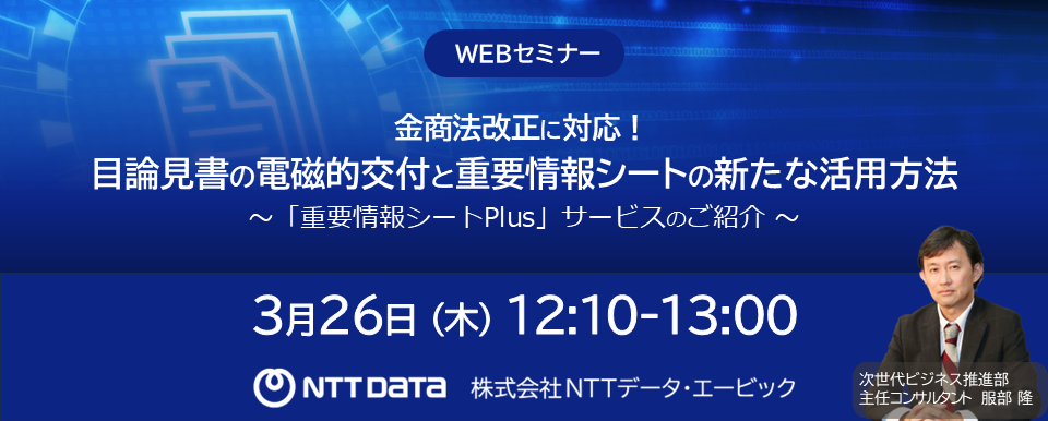 株式会社NTTデータ・エービック(本社:東京都港区、代表取締役社長 大谷 温仁、以下「当社」)、金融機関様の投資信託販売を支援する当社サービスに関するWEBセミナーを随時開催しています。3月は、4つのWEBセミナーを開催します。